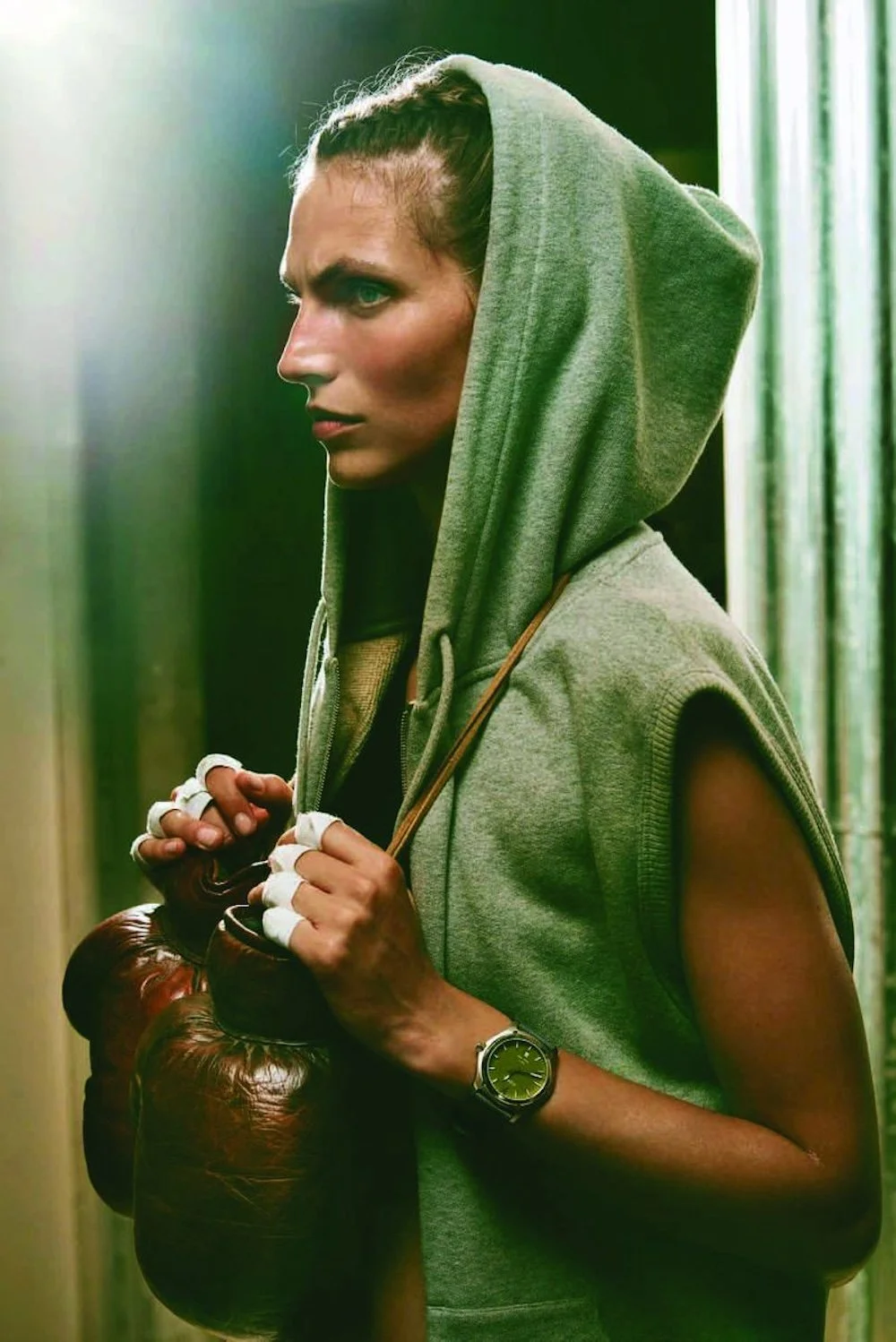 Stylist Sylvie Clemente is ringside, preparing Caune to fight, fight, fight — as women did in Sparta. Photographer Thiemo Sander [IG] photographs the fashion action for Madame Figaro; and AOC takes a seriously-informed deep dive into the health benefits of boxing. / Hair by Kazuko Kitaoka; makeup by Maria Olsson