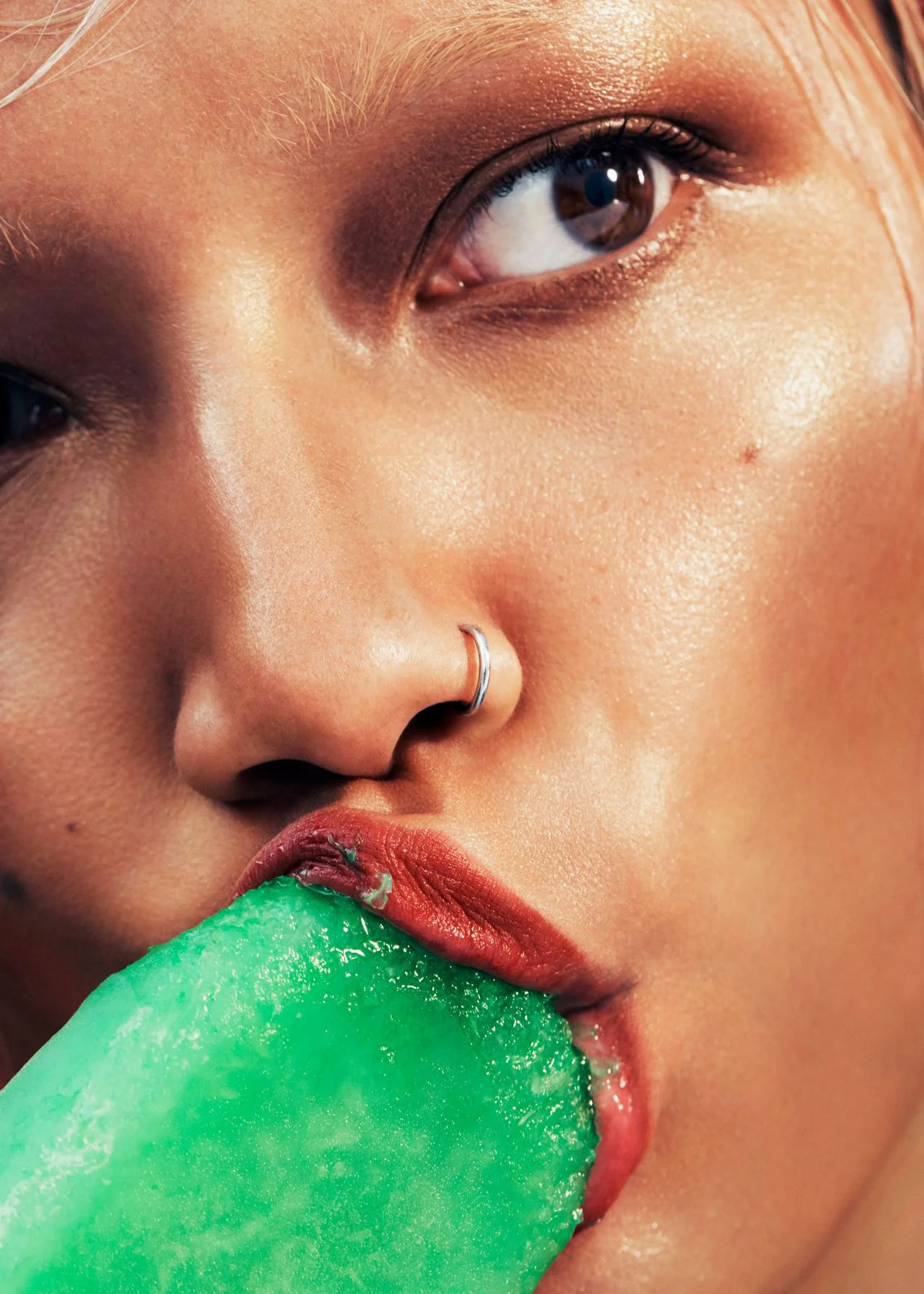 /Models.com shares its latest beauty editorial, a set of visually arresting hot weather beauty visually featuring model Charlotte Carey. Taste and tingling props give photographer Alex John Beck the inside track on high impact, magnetic beauty artistry for 'Summer Skin'with hair by Marco Braca and glittering makeup by Morgane Martini.