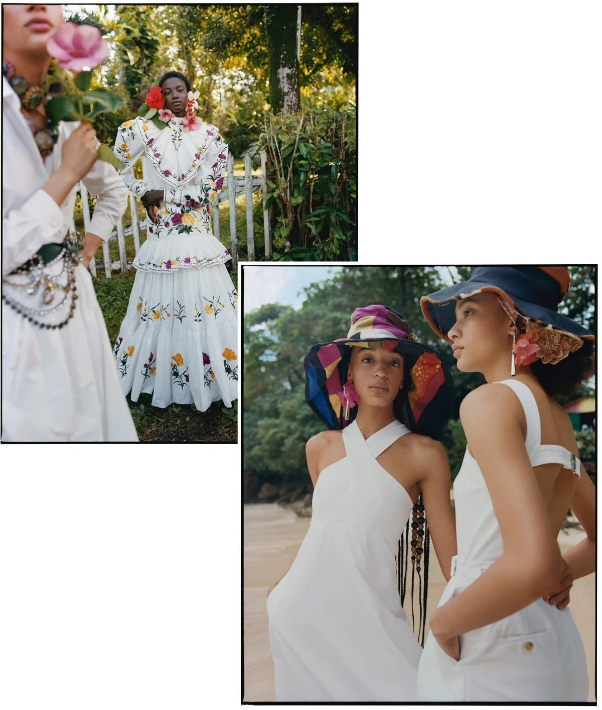 Models Anok Yai, Indira Scott and Selena Forrest are styled by Tonne Goodman in ‘Material Values’. Photographer Nadine Ijewere captures the belles for Vogue US March 2020./ Hair by Edward Lampley; makeup by Grace Ahn