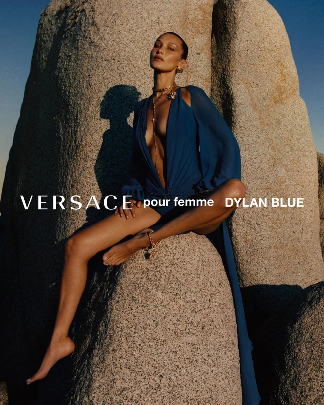 Supermodel Bella Hadid scorches the earth, lensed by Harley Weir for the new Versace Dylan Blue campaign, Fall 2020.