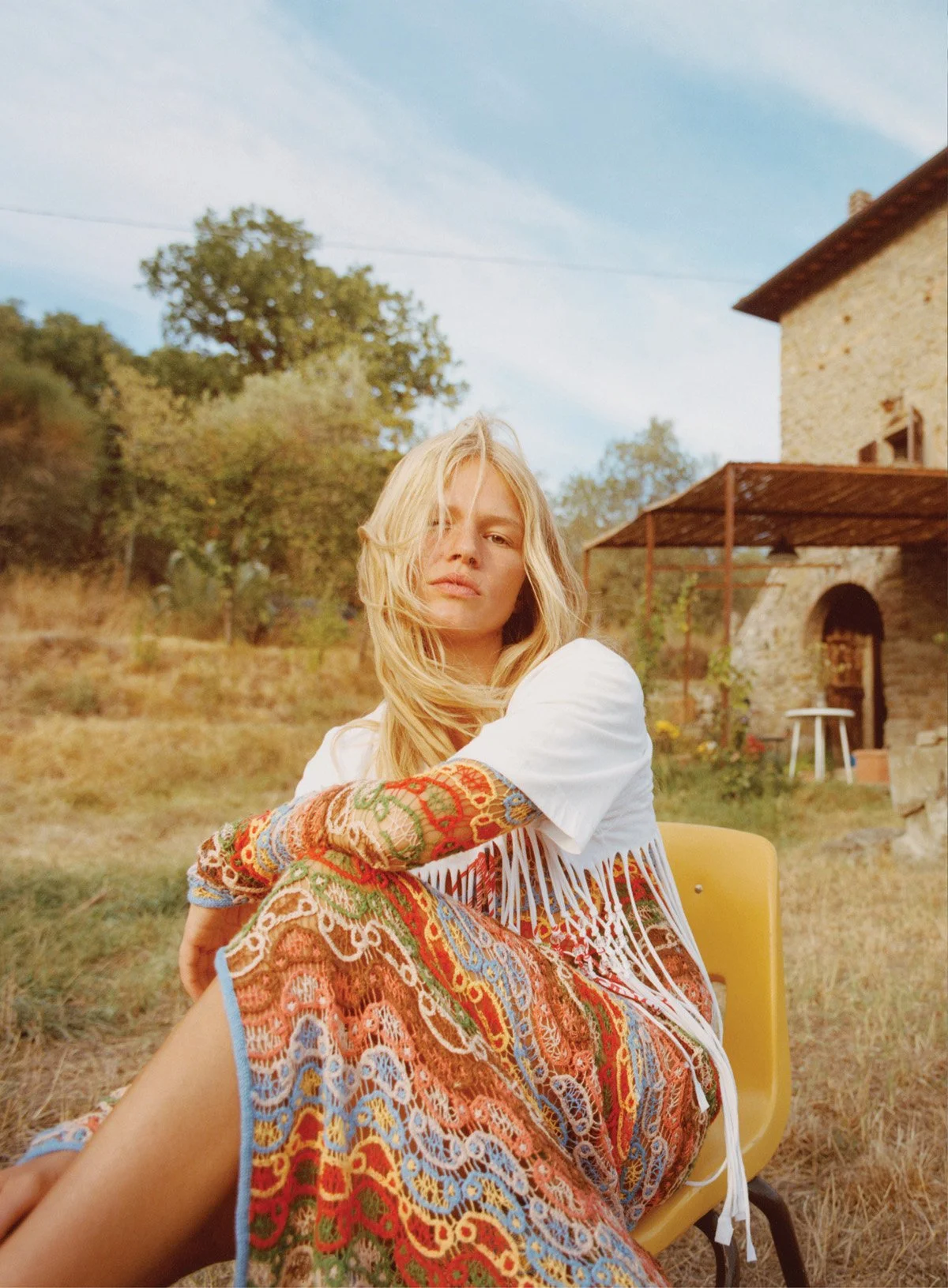 Top model Anna Ewers plays the role of ‘Golden Girl’, styled by Julia von Boehm in casual luxury, boho separates. Photographer Tom Craig chases the sun for InStyle US November 2021./ Hair by Giulio Ordonselli; makeup by Arianna Campa