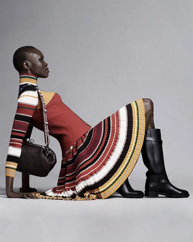 In Fall 2021 Alek Wek collaborates with Weekend Max Mara on a Signature capsule collection. Mixing “African culture with a London calling vibe and a touch of Boho,” the United Nations’ Good Will Ambassador combined references from her origins in South Sudan with the shared needs for versatility among today’s women on the move.