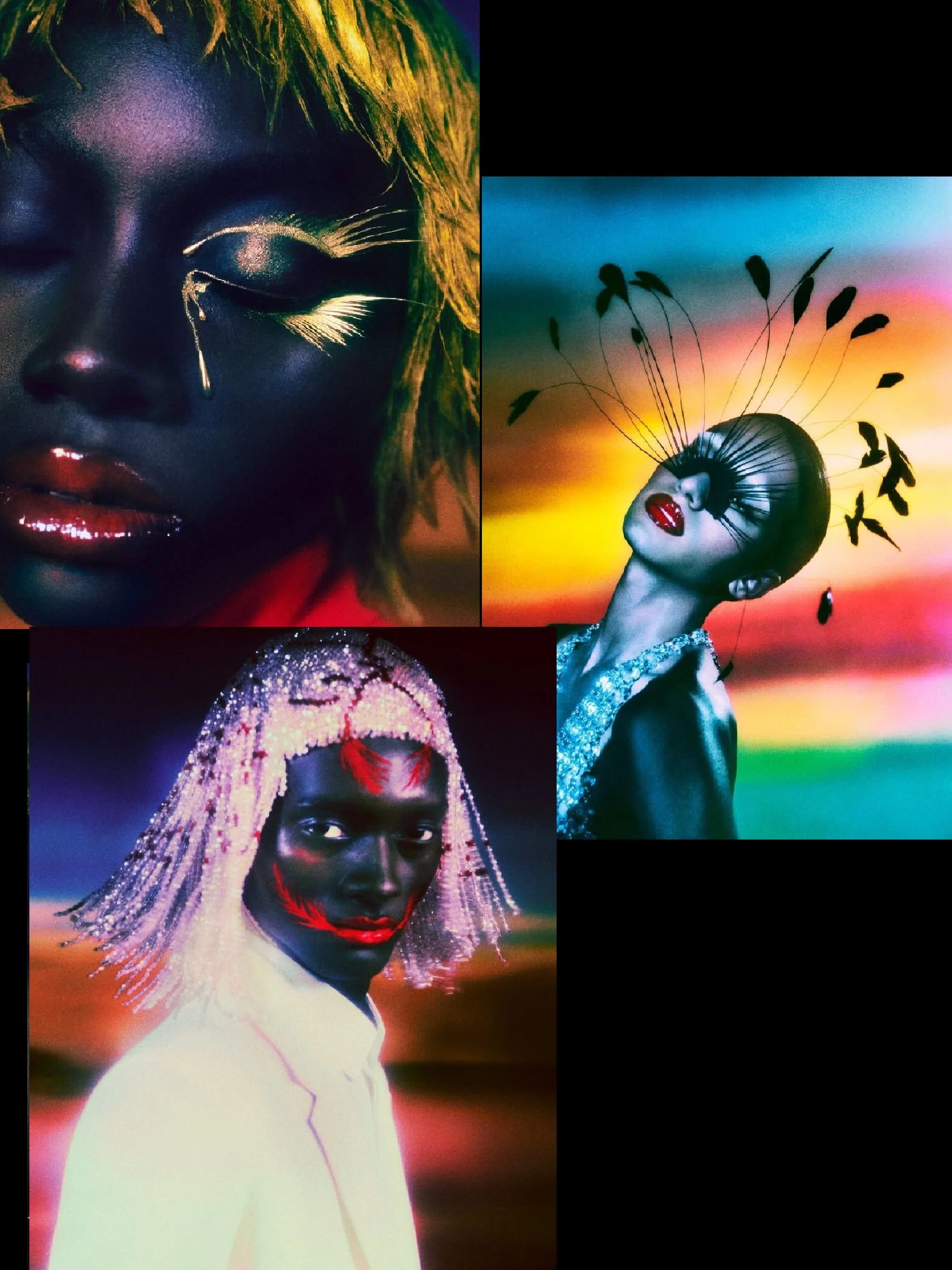 Models Bangali Drammeh, Binta Diop and Nikki Kahr are styled by Ola Etiti in ‘Eyes Wide Shut’. Photographer Elizaveta Porodina [IG] captures the primordial birth of modern beauty faces for Dazed Magazine./ Hair by Kiyoko Odo; makeup by Raoul Alejandre
