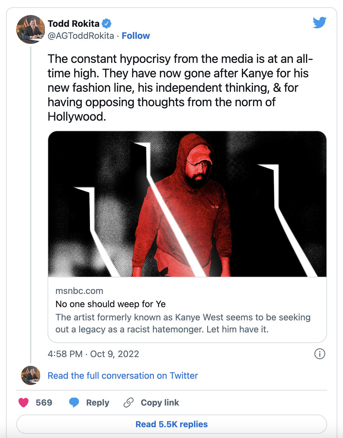/Indiana’s public news media WFYI reports that Attorney General Todd Rokita “came to the defense” of rapper Ye, known to the world by his former name of Kanye West. Roika wrote: “The constant hypocrisy from the media is at an all-time high. They have now gone after Kanye for his new fashion line, his independent thinking, & for having opposing thoughts from the norm of Hollywood.”