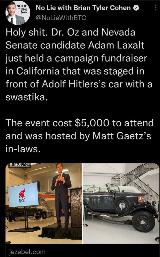 Given all the recent accusations of white nationalism and anti-Semitism against Republicans, it was a bit dicey that behind Republican PA Senate candidate Dr. Mehmet Oz's podium was a TV monitor showing the logo for the National Republican Senatorial Committee, and a dark blue wagon — 1939 Mercedes-Benz Model G4 Offener Touring Wagon.