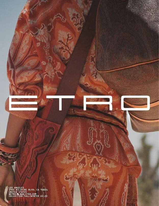 The Fall 2022 campaign with models Mica Arganaraz and Sam Mallos, shot by photographer Henrik Purienne in Palm Springs, CA was described by the Etro family creatives as “our road to nowhere towards faraway worlds, sun-drenched as far as the eye can see, strong in the nomadic and curious spirit that has always pushed us forward, because it is never the destination that counts, but the journey itself”.