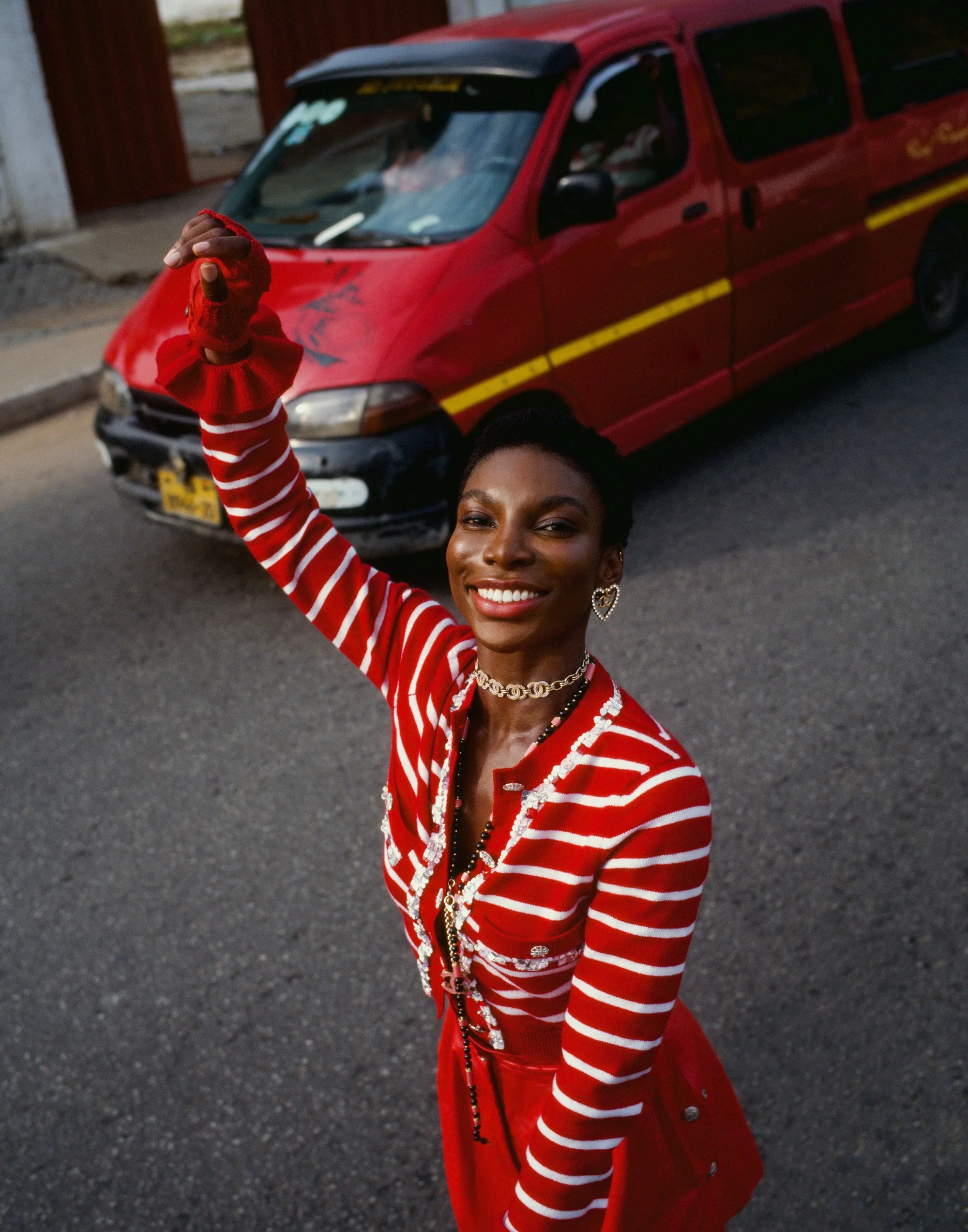 She remembers attending the London premiere of ‘Black Panther’ in a halter-neck dress she’d made out of wax print fabric her mother had brought back from Accra. “I thought to myself, I’m definitely going in something African,” she says. Unbeknownst to Coel, director Ryan Coogler already had his eye on her, and he noticed how easily she mingled with cast members. “Aneka, the character Michaela plays, is kind of a rebel,” says Coogler. “It made a lot of meta sense with Michaela being someone who is pushing the industry forward and carving out her own space.”