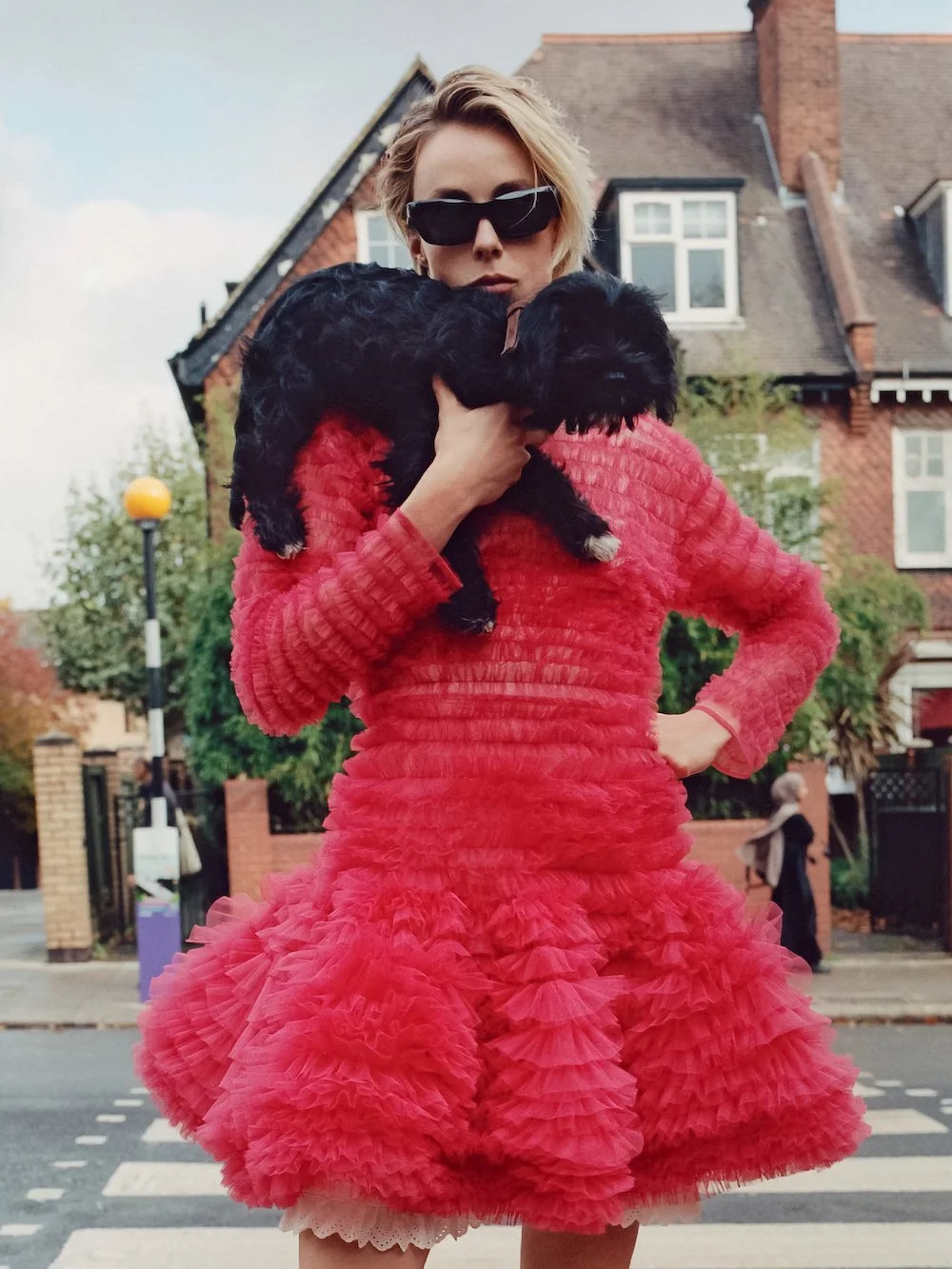 Misha Taylor [IG] is behind the lens for this weekend’s November 13, 2022 issue, with Edie and Tootsie in picture-perfect poses, dazzling us in a Molly Goddard dress with Bottega Veneta shades. Edie’s other dog named Pam also joins the photo shoot fun.