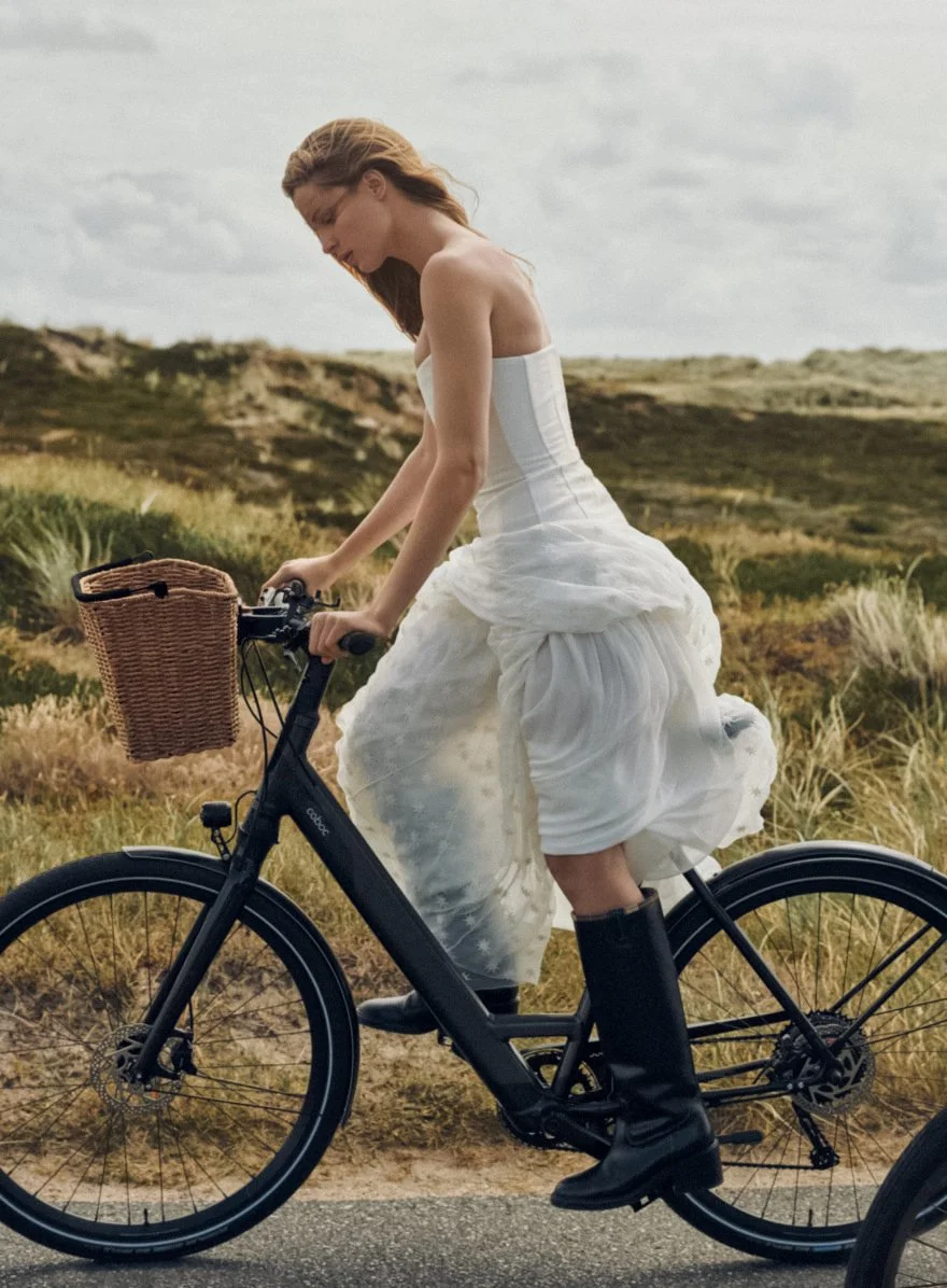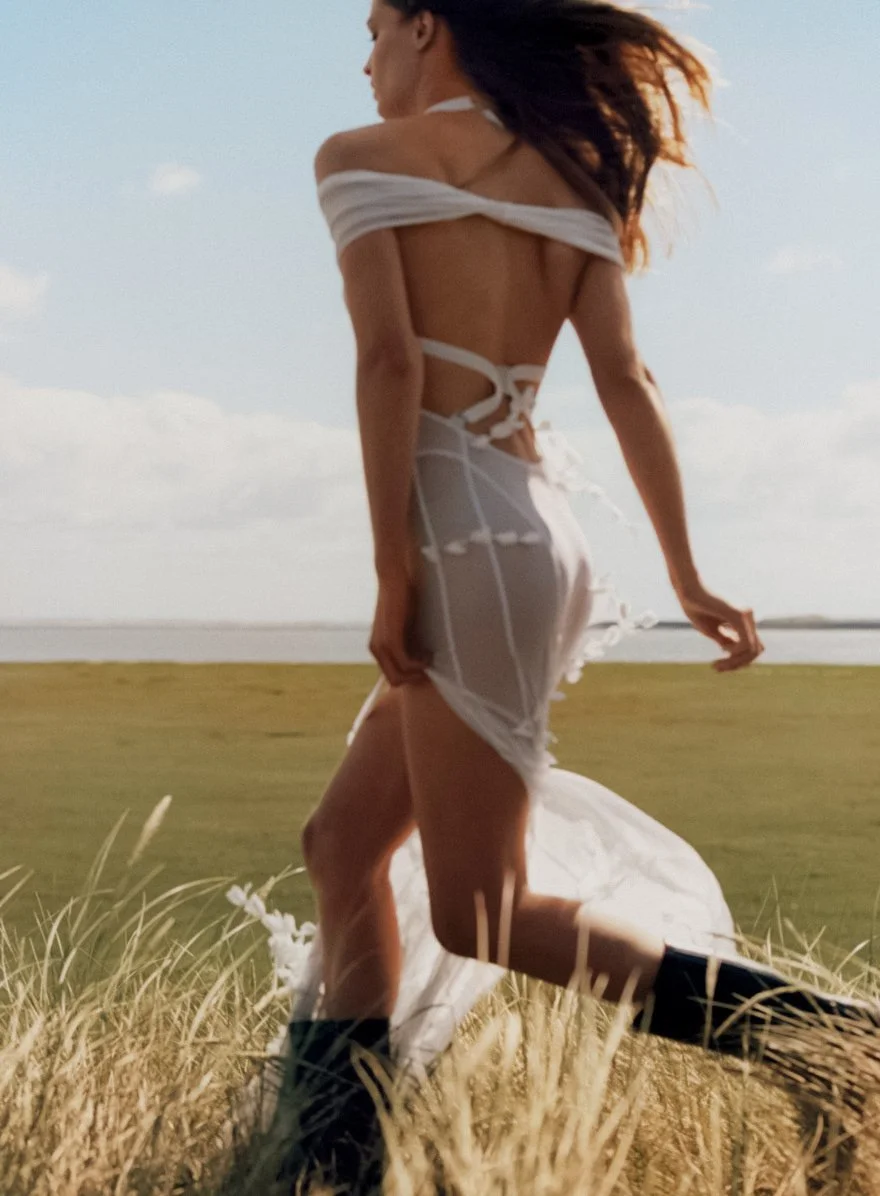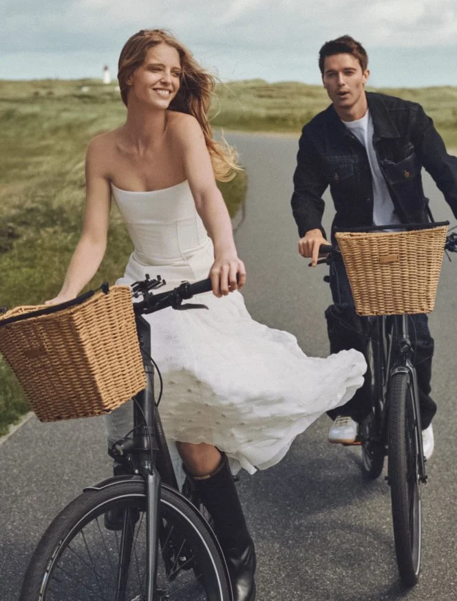 Models and life partners Abby Champion & Patrick Schwarzenegger are styled by Tabitha Simmons in ‘Coming Clean’, a health and wellness fashion story. Photographer Dan Martensen [IG] is on location on the island of Sylt — where the legendary medispa Lanserhof [IG] opened a lavish new resort earlier this year. Sylt is a German island in the Frisian archipelago in the North Sea./ Hair by Cim Mahony; makeup by Lisa Houghton