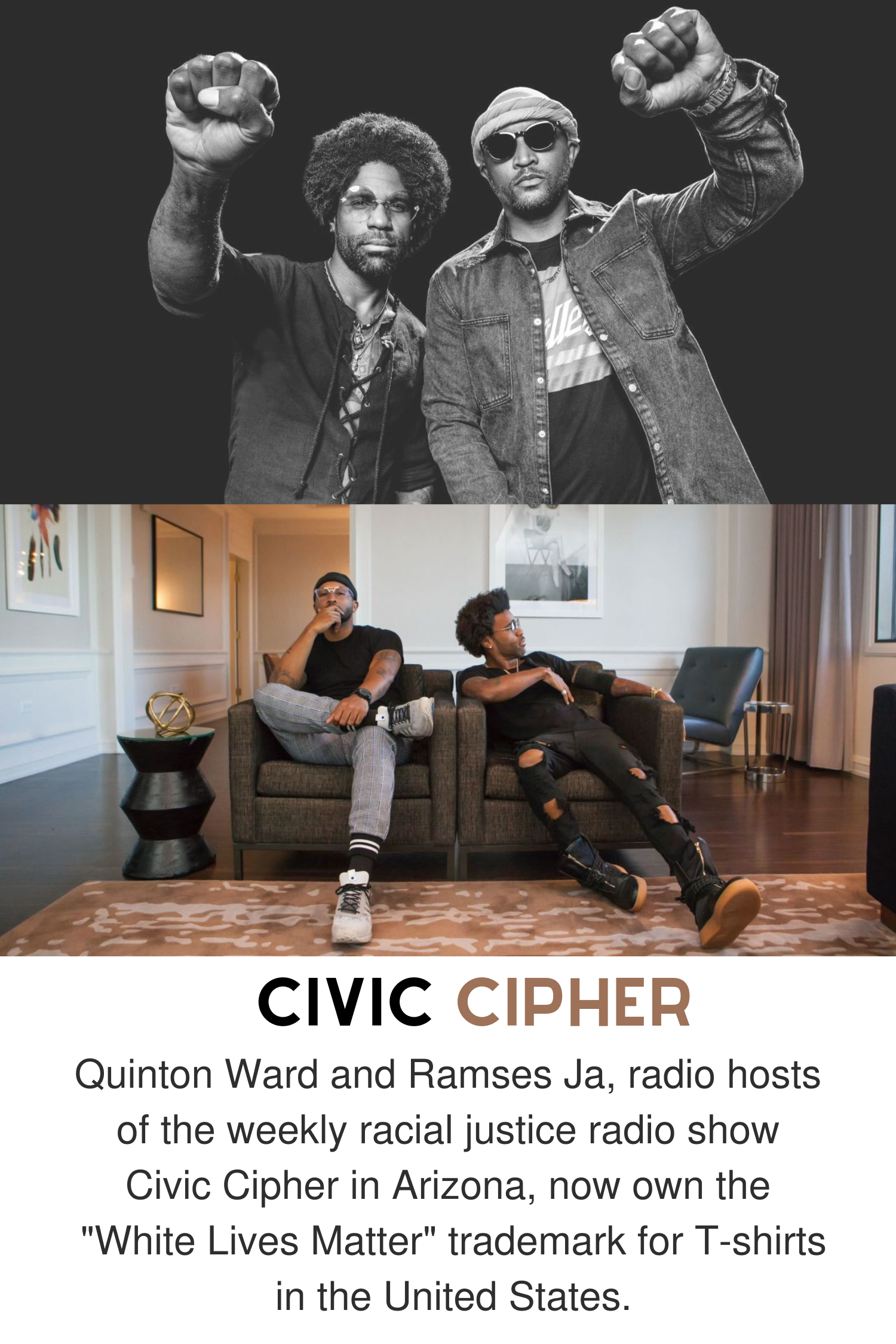 Civic Cipher is on Apple Podcasts. Here’s some content. Here is their blog. And lastly, here are the guys Ramses Ja and Quinton Ward talking about their show Civic Cipher, but they do touch on owning the “White Lives Matter” trademark and Kanye West. I’ll be watching. ~ Anne
