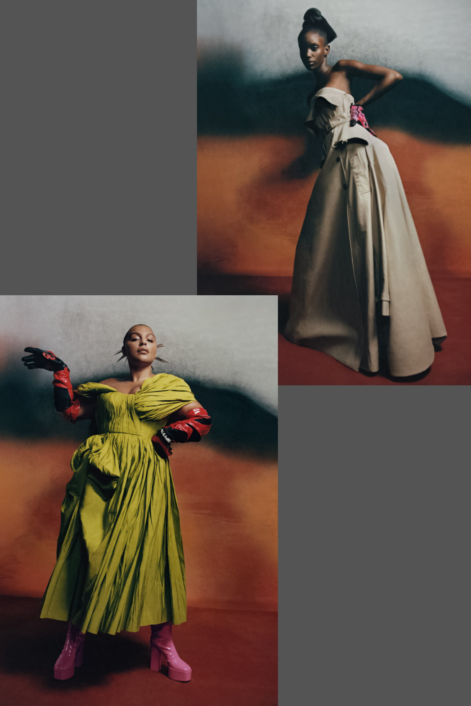 / Anne EnkeModels Maty Fall and Paloma Elsesser make a ‘Grand Entrance’ just in time for the holidays, styled by Julia Sarr-Jamois in big-volumes, glam sophistication. Photographer Nadine Ijewere is in the studio for British Vogue December 2022./ Makeup by Ammy Drammeh; hair by Shiori Takahashi