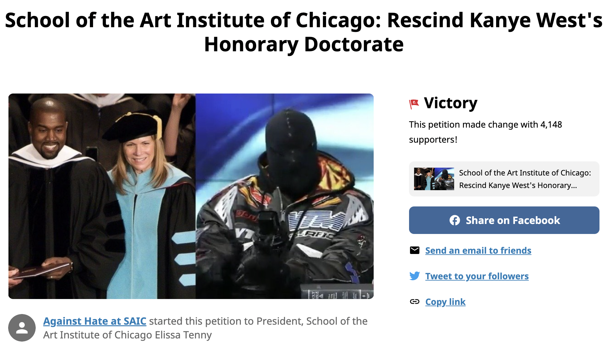 On December 1, a group called “Against Hate at SAIC” published a Change.org petition calling on president Tenny to rescind Ye’s degree. “Regardless of his contributions prior to the receipt of this award, it is harmful to allow Ye…to continue to use the School of the Art Institute of Chicago to help legitimize hatred and violence,” the document read. It has since amassed over 4,000 signatures.