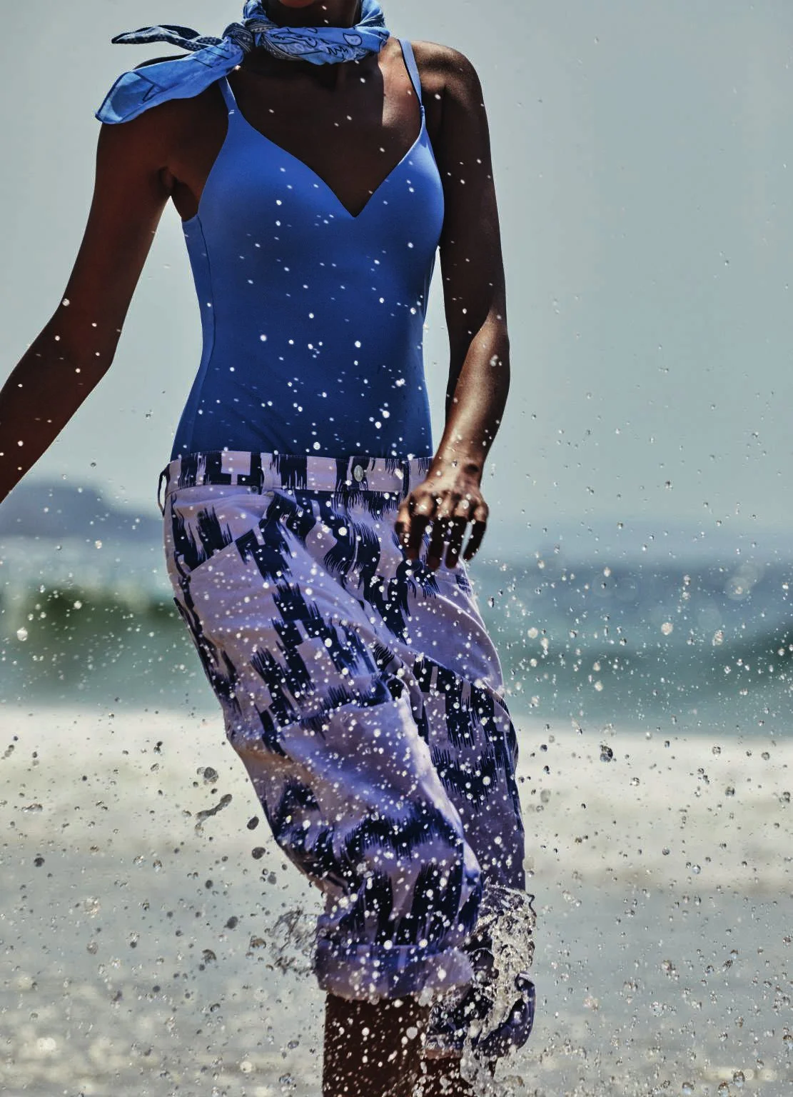 French model Aya Jones enjoys sea and surf, styled by Miki Sessa in ‘Good Vibrations’, lensed by Simon Upton [IG] for ELLE Italia May/June 2022./ Hair by Peter Butler; makeup by Eric Politico
