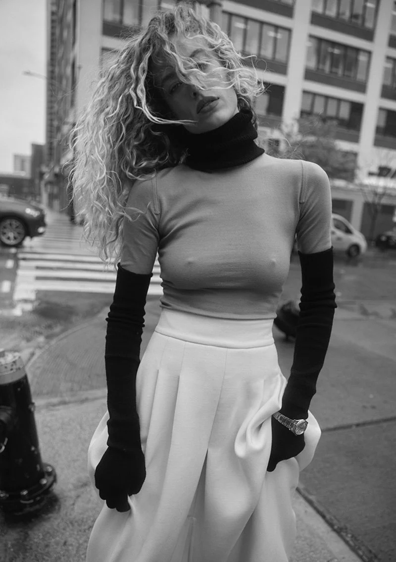/Hannah Ferguson is a ravishing 21st century, sensual goddess, lighting a working-woman’s, sartorial bonfire in the September 2022 issue of ELLE Germany.