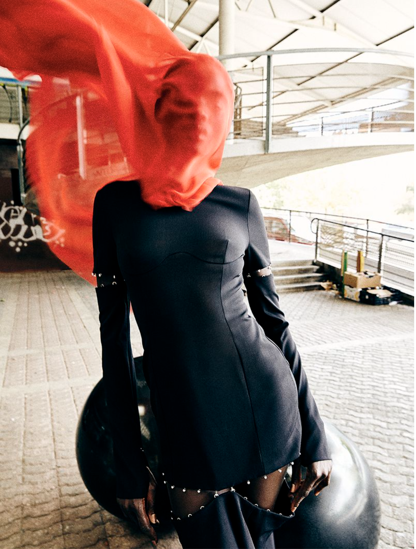 Photographer Rocio Ramos [IG] is on her A-game with this fashion story ‘Structured Chaos’. Senegal to Belgium model Sokhna Niane makes a wow impression in a fashion story brimming with precious touches — like the red scarf breezing over her face below.