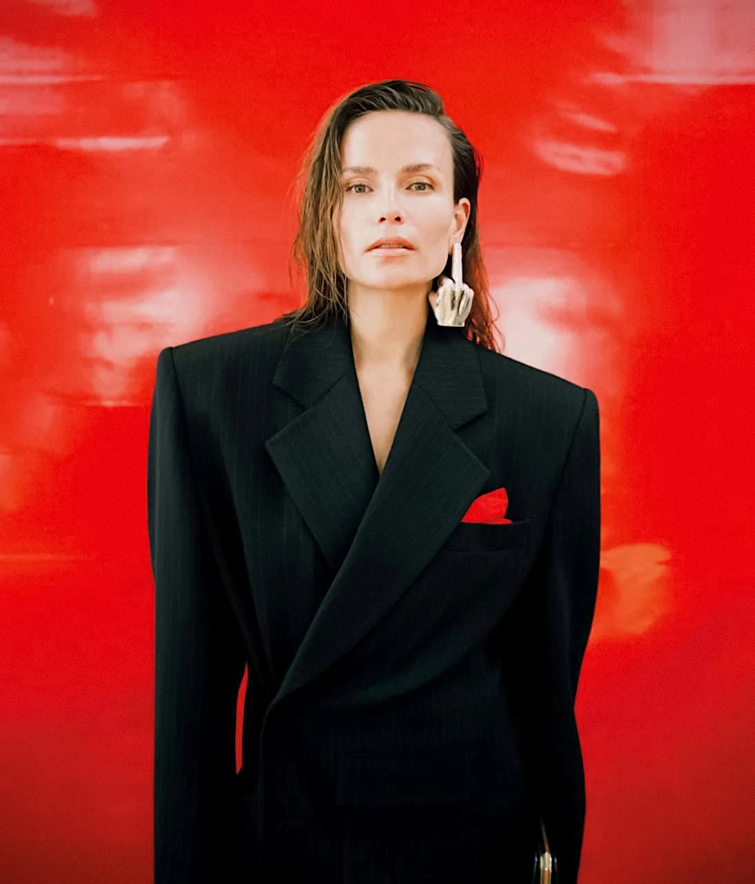 Top model Natasha Poly is styled by James Valeri in a black and white with red accents fashion story ‘Something About Poly’. Valeri chooses modern, curves-rich silhouettes lensed by Davit Giorgadze [IG] for d la Repubblica October 7th, 2023. / Hair: Akemi Kishida; Make-up: Stephanie Kunz