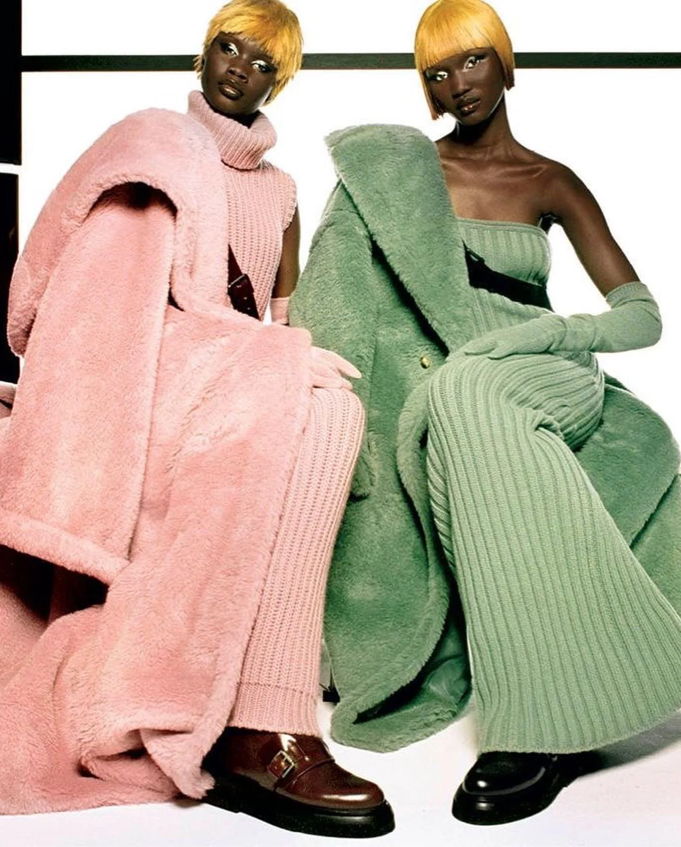 Models Abény Nhial and Mary Ukech, both with South Sudan heritage, twin in the December 2023 issue of Vogue Japan [IG]. Mega talent stylist Patti Wilson [IG] adds her modern glam vision to the fashion story lensed by Hugo Comte [IG]./ Hair by Anastaslia Tymoshchuk; makeup by Lisa Michalik