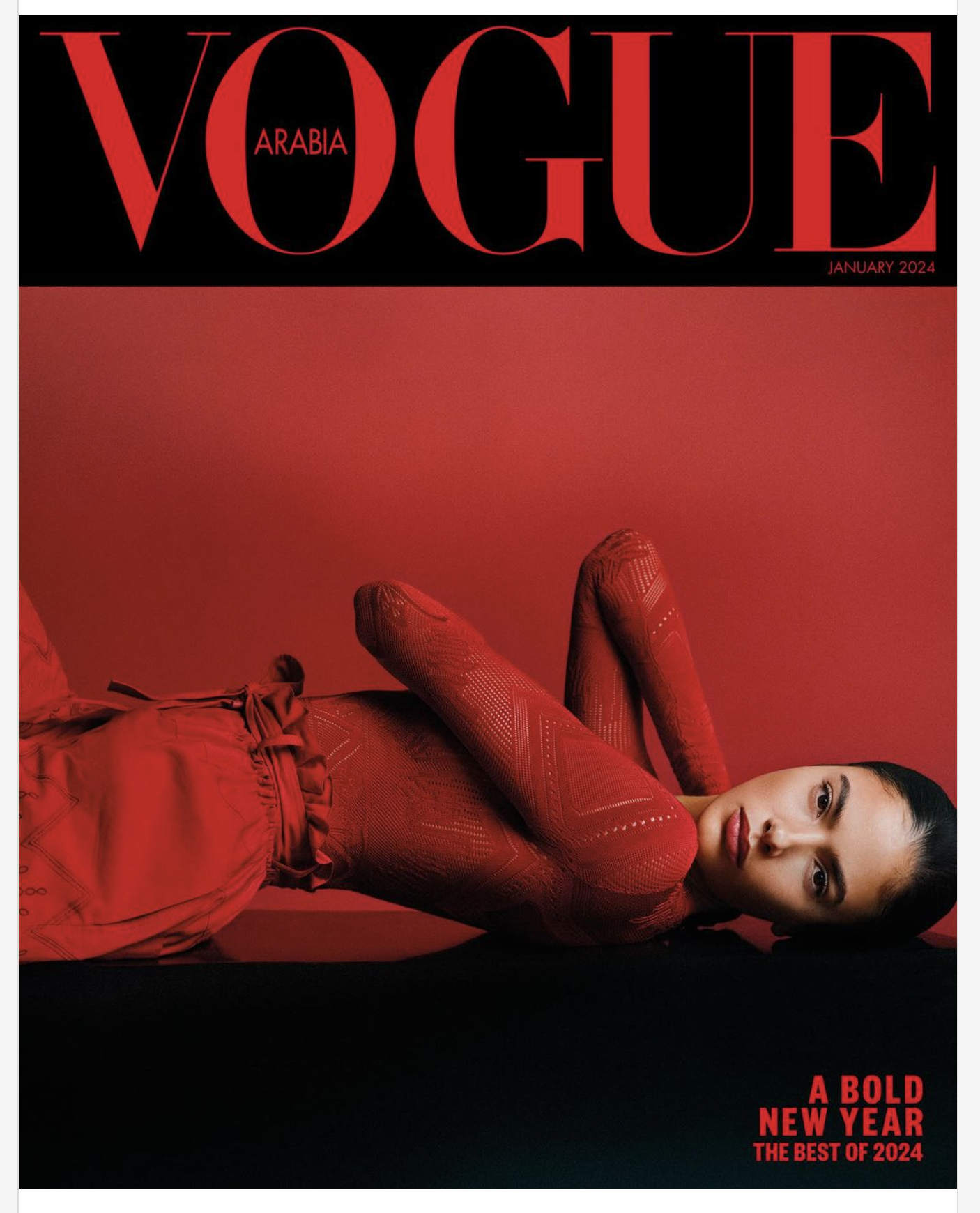 /Marrakech-born, America resident, Moroccan model Rania Benchegra takes two covers for the January 2024 issue of Vogue Arabia.