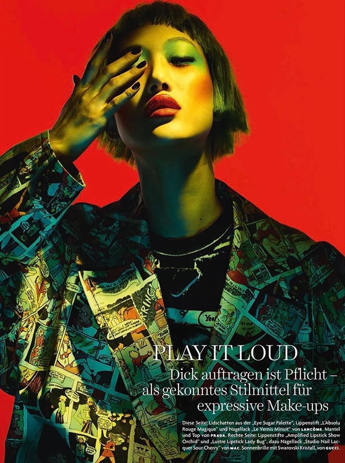 Top model Sora Choi takes the beauty spotlight in ‘Play It Loud’ for the February 2023 issue of Vogue Germany [IG]. Nicola Knels styles Sora in images by Ben Hassett [IG]. / Hair by Joey George; makeup by Marla Belt