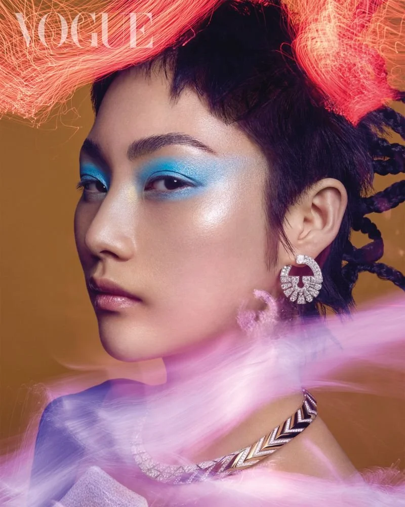 Model Yue of City Models Paris makes a vivid impression about modern elegance, styled by Pablo Patane in bold pieces from the fourth [2022] Louis Vuitton Spirit High Jewellery Collection.