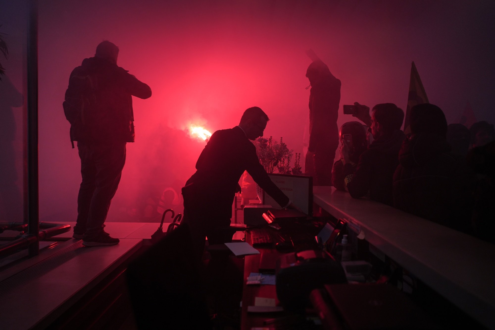 /The protests against French President Emmanuel Macron’s pension overhaul escalated Thursday as a crowd of men waving flares and banners stormed the headquarters of luxury conglomerate LVMH Moët Hennessy Louis Vuitton SE.
