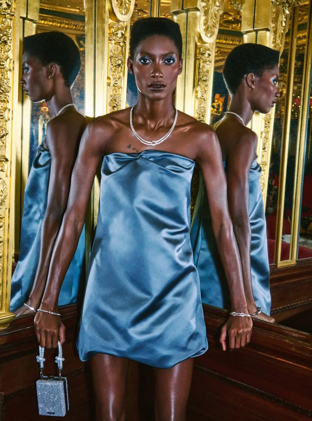 The fashion story ‘More is More’ showcases unadulterated, robber-baron opulence, and acts as a perfect backdrop for Camara’s strong persona and physical presence. Miranda Almond styles the dazzling fashion statements lensed by Jem Mitchell [IG]. / Makeup by Joey Choy; hair by Tyler Johnston