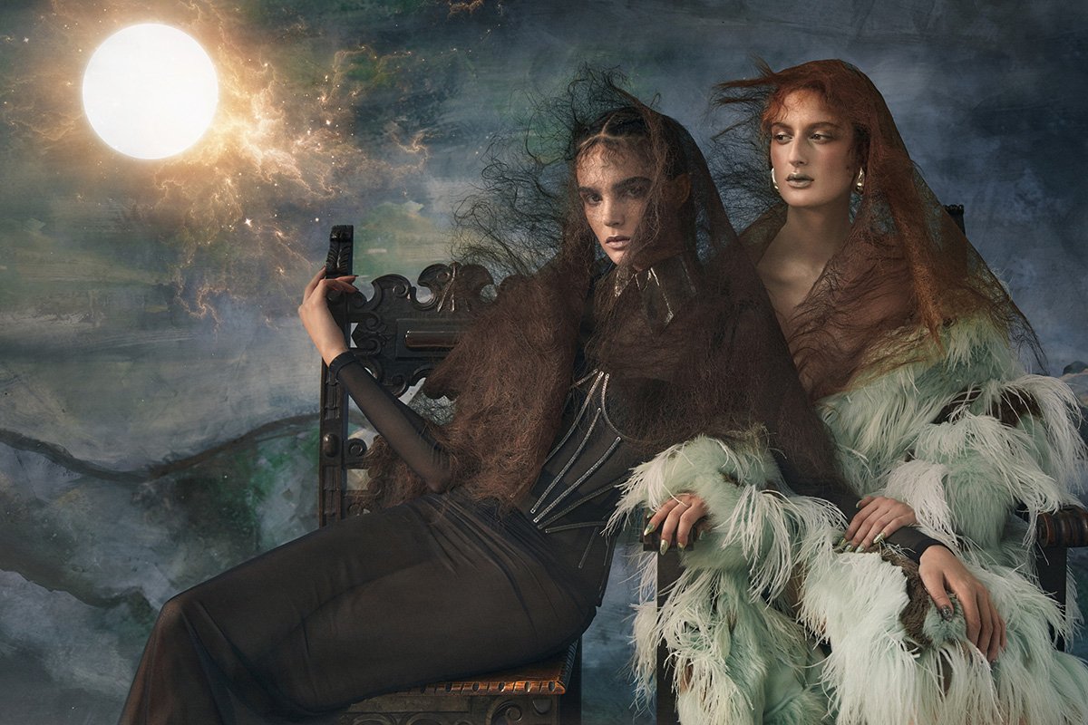 Models Alcestes Shaba and Matilde Buoso [on the cover] pose for ‘Cosmic Journey’, a fashion story in the June 2023 issue of Vogue Portugal [IG] ‘Voyage’ issue. Pablo Patanè styles the shoot in images by Alessandro Esposito [IG]/ Hair by Giovanni Iovino; makeup by Simone Gammino