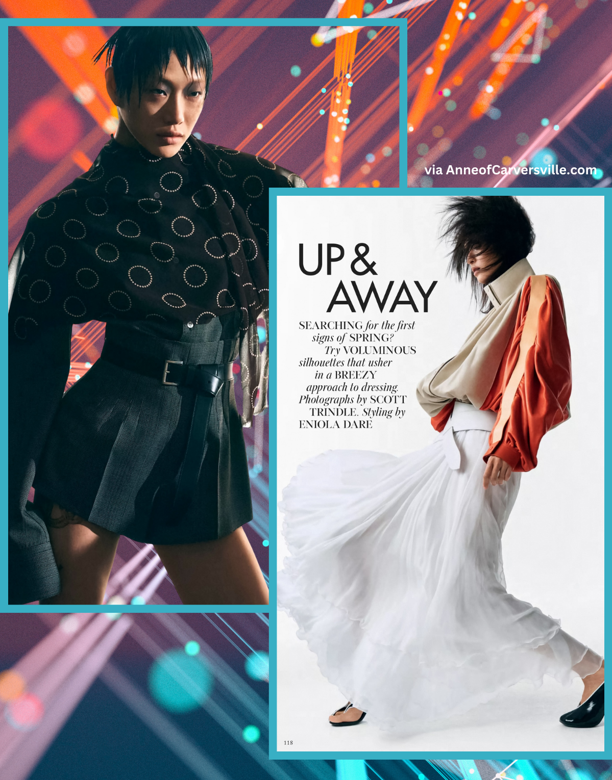 Top models América González and Sora Choi are styled by Eniola Dare in ‘Up and Away’. The voluminous, breezy fashion looks from Burberry, Giorgio Armani, Louis Vuitton, Junya Watanabe, Michael Kors Collection, Prada, Ralph Lauren Collection are lensed by Scott Trindle [IG]for British Vogue [IG] February 2024./ Hair by Eugene Souleiman; makeup by Janeen Witherspoon