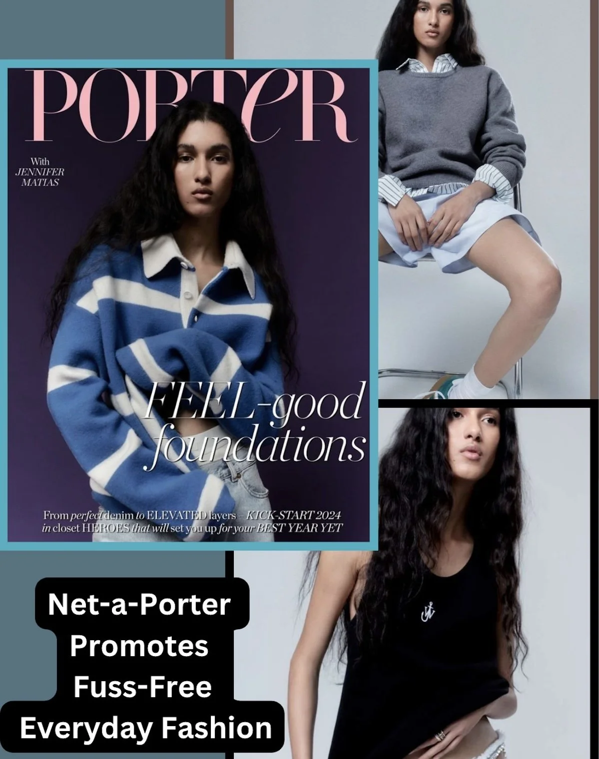Net-a-Porter [IG] kicks off 2024 with a focus on ‘Feel-Good Foundations’, faced by Brazilian model Jennifer Matias. Fashion editor Charlotte Blazeby, stylist on this Porter cover shoot, describes the mood of January as “fuss-free, everyday fashion – a representation of how we truly want to dress”.
