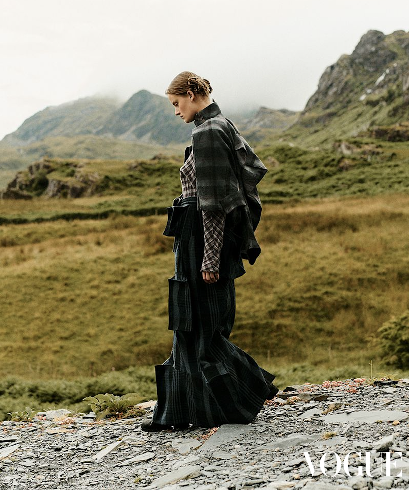 British model Saunders poses in ‘Modern Nomad’, a noble origins fashion story shot on a very rainy day in North Wales by Daniel Benson [IG]. Editor Jonathan Yee and Thea Lewis-Yates style the plaid and tweed riches in traditional colors for Vogue Hong Kong [IG] August 2024 issue./ Hair and makeup by Lou Box