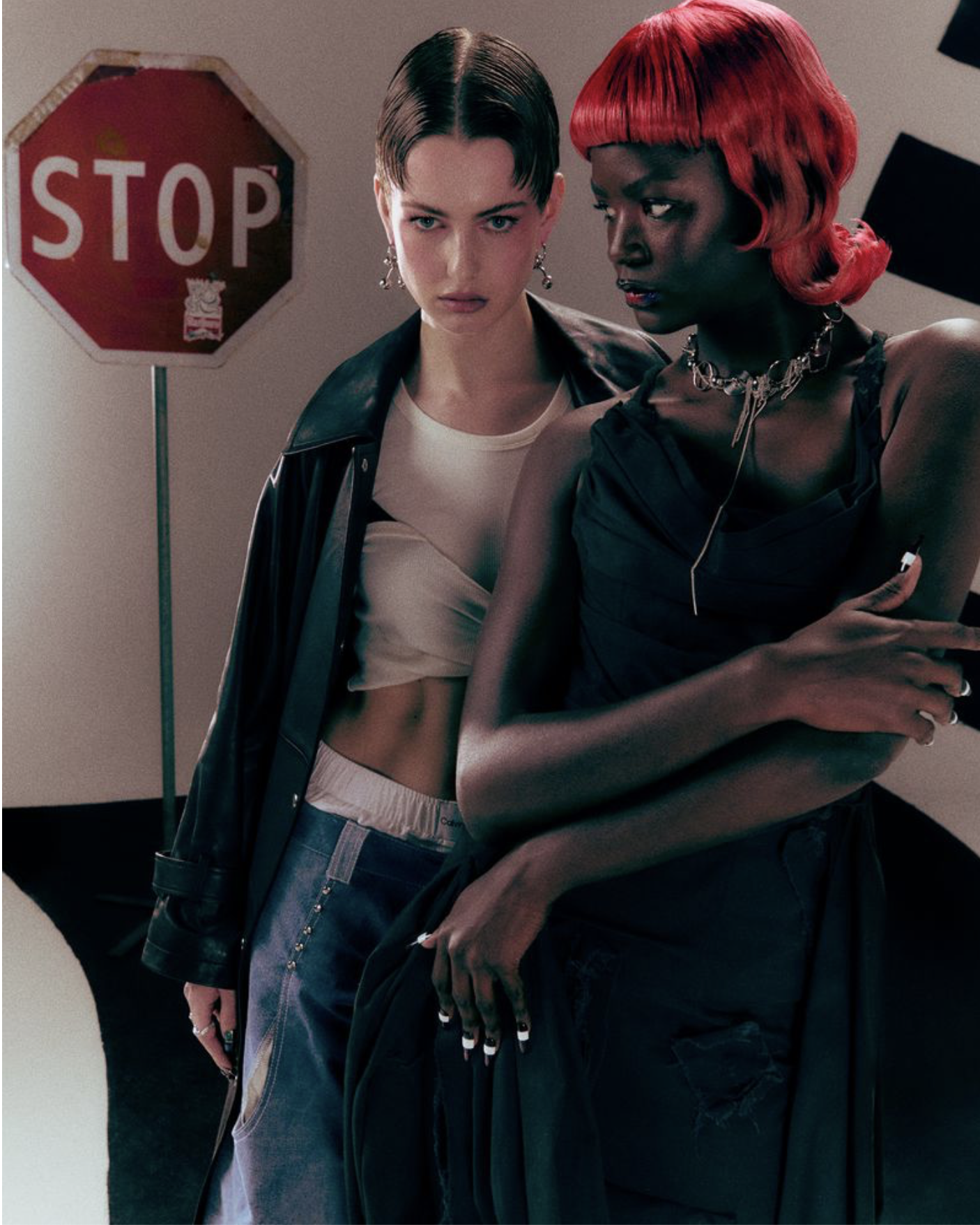 Models Lando and Mouna Fadiga stir the pot of human delight, inspired by “a playful and bold approach to classic New York City traffic madness”, styled by Amber Aste./ Hair by Biance Van Zwieten; makeup by Björn Mohamadmoesman; set design Gini Grootenboer