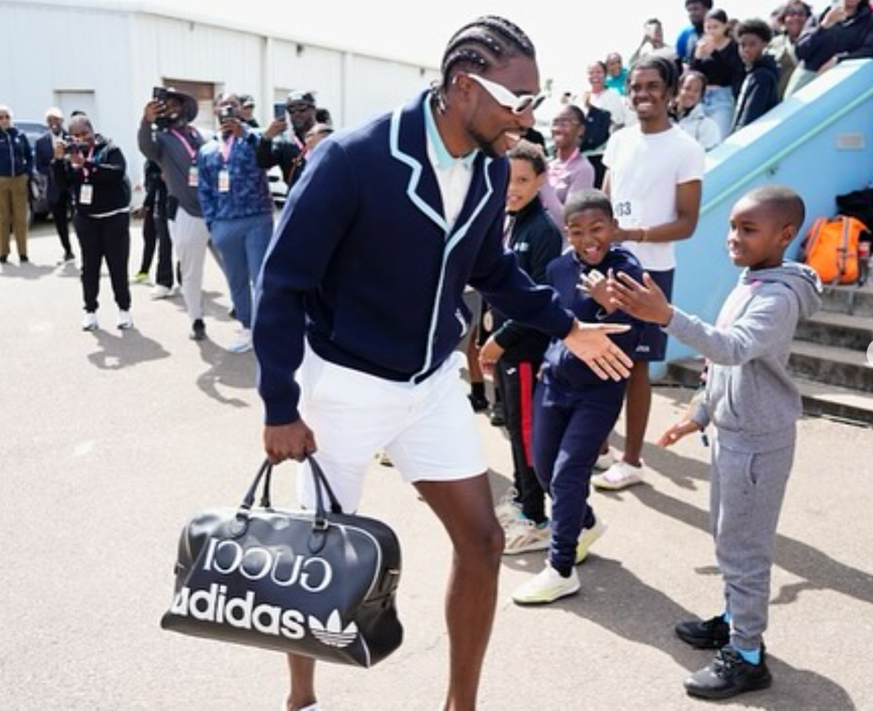 Lyles has carried his idea forward, dressing for success at all times. In this image from his IG, the fast-man athlete headed to Paris did his slow walk in Bermuda in early May wearing Louis Vuitton and carrying a bag from the Gucci x Adidas collab under Allesandro Michele.