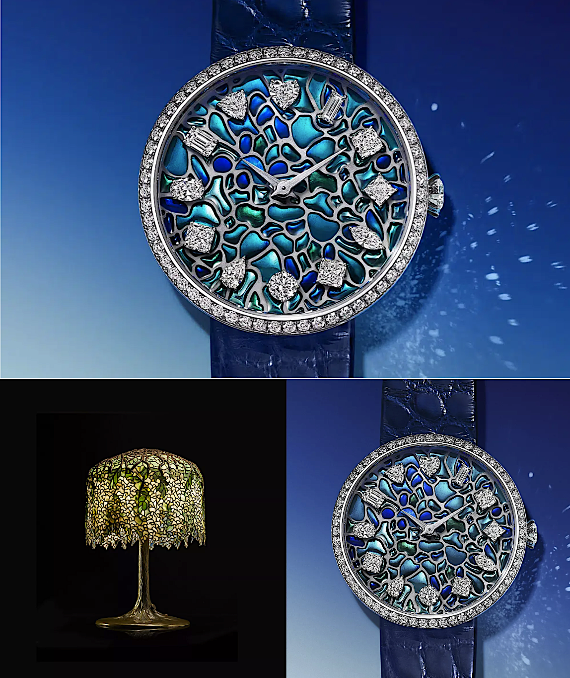 Now that AOC friends understand the methodology used to create this exquisite Tiffany watches collection, the Eternity by Tiffany Wisteria Enamel watch above should remind us of the Tiffany Studios’ famed Wisteria lamp.