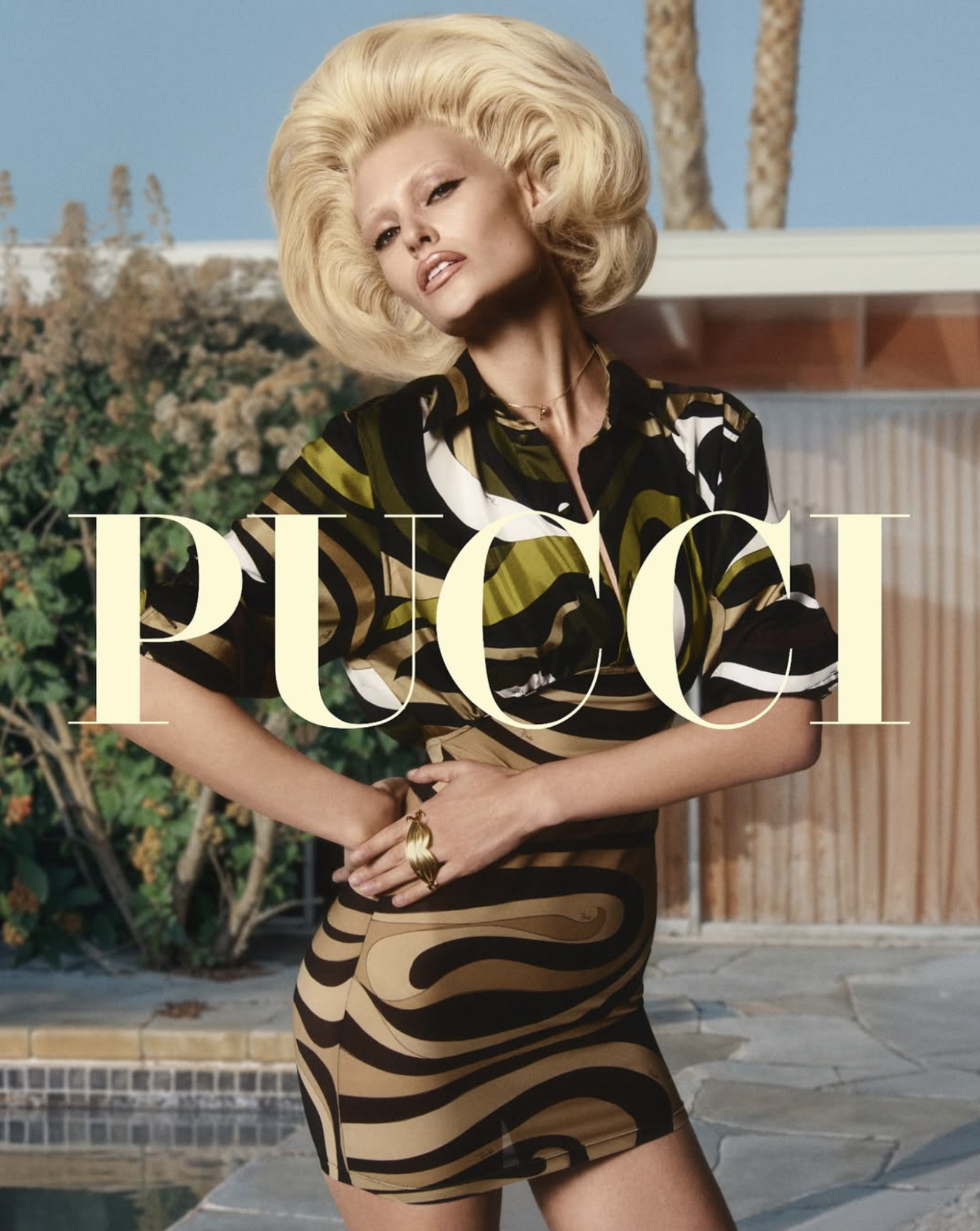 /In Pucci’s latest images from the Marmo Spring 2025 campaign, model Bibi Breslin gone blonde seems to channel Marilyn Monroe and 1960s Palm Springs life in images by Drew Vickers [IG].