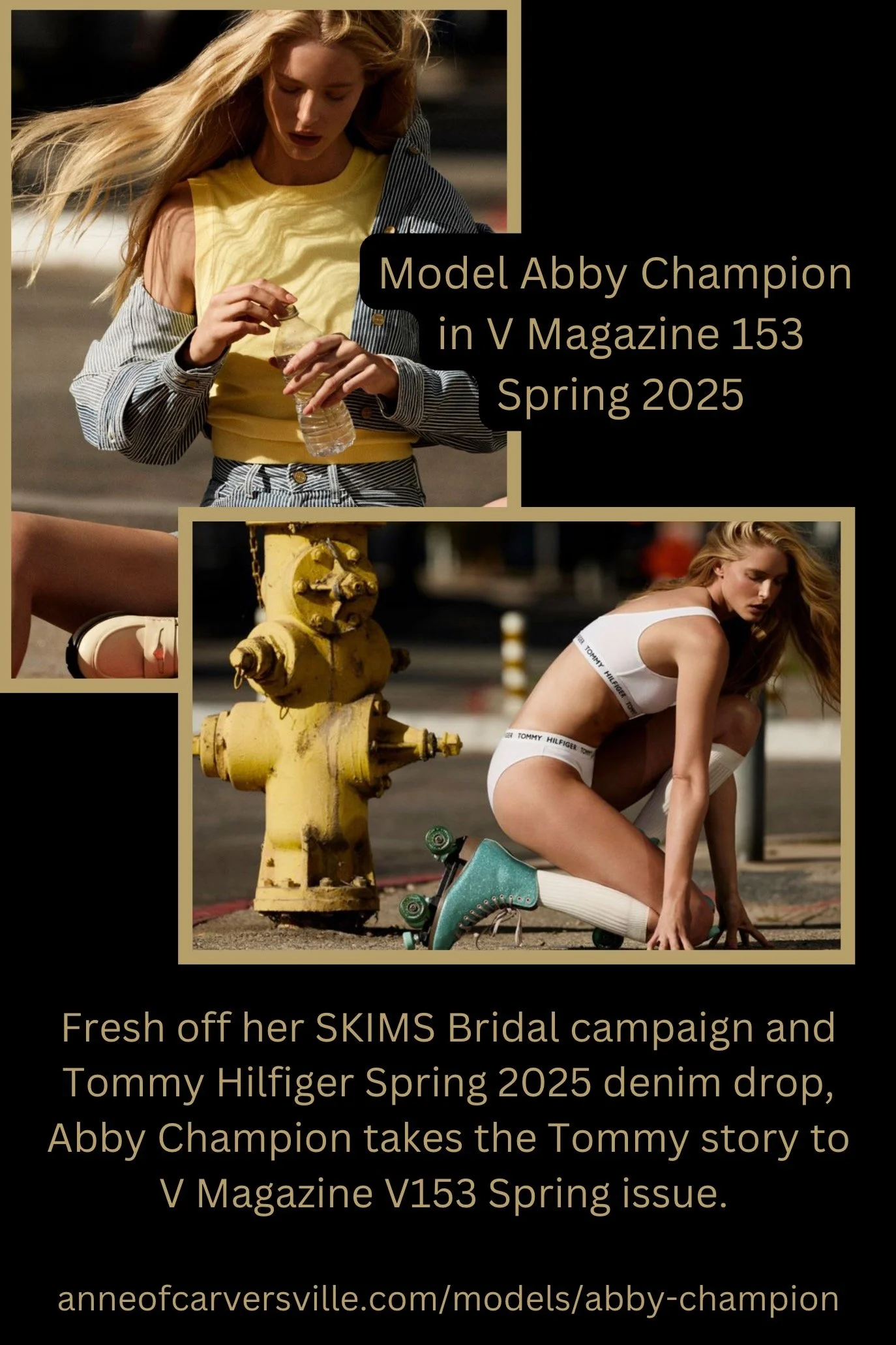 Abby Champion’s love for Tommy Hilfiger has deep roots in her Alabama family. Fresh off her new SKIMS Bridal Campaign with fiancé, actor Patrick Schwarzenegger, Champion races into the pages of V Magazine V153 [IG].