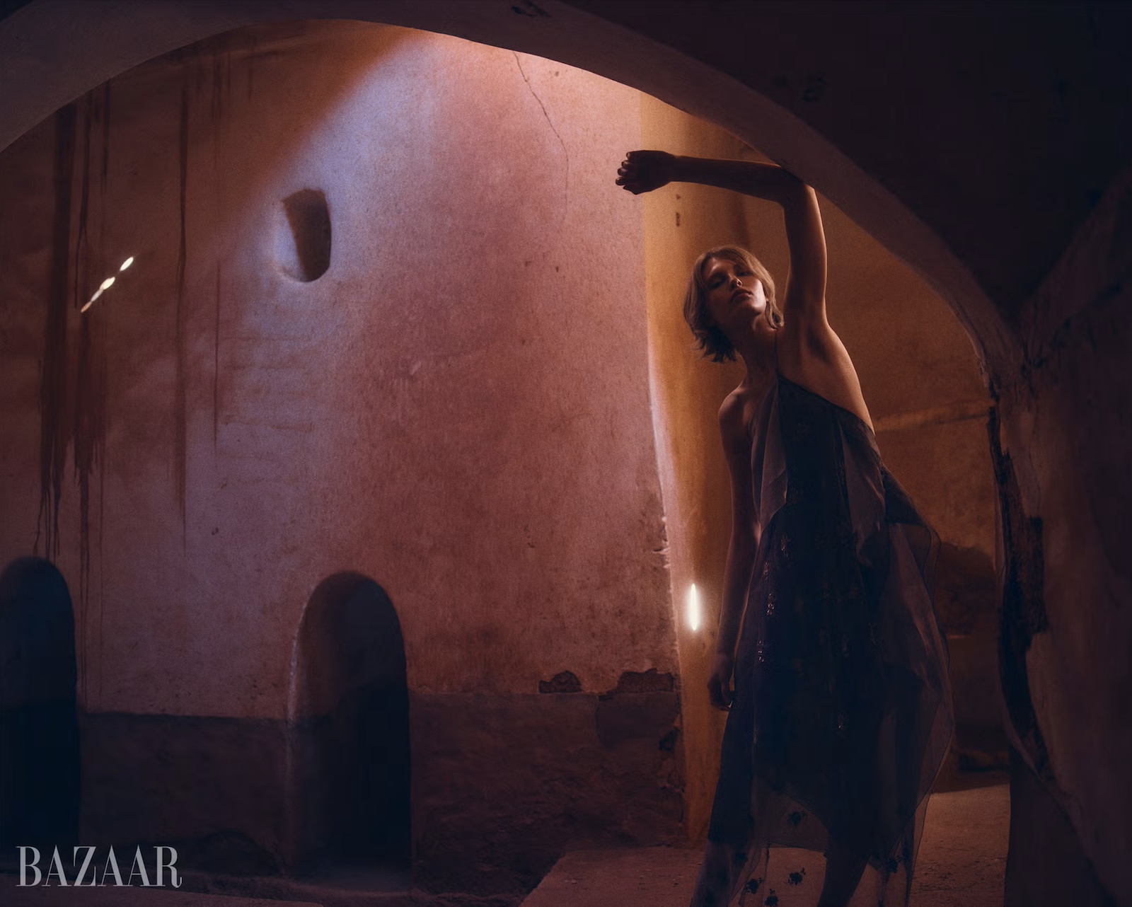 /Model Karolina Spakowski spreads her spirit wings in Morocco, photographed by Josh Olins [IG] in ‘The Sheltering Sky’. James Valeri styled the German muse based in Paris for US Harper’s Bazaar March 2025. See product details. / Hair by Cim Mahony; makeup by Adrien Pinault