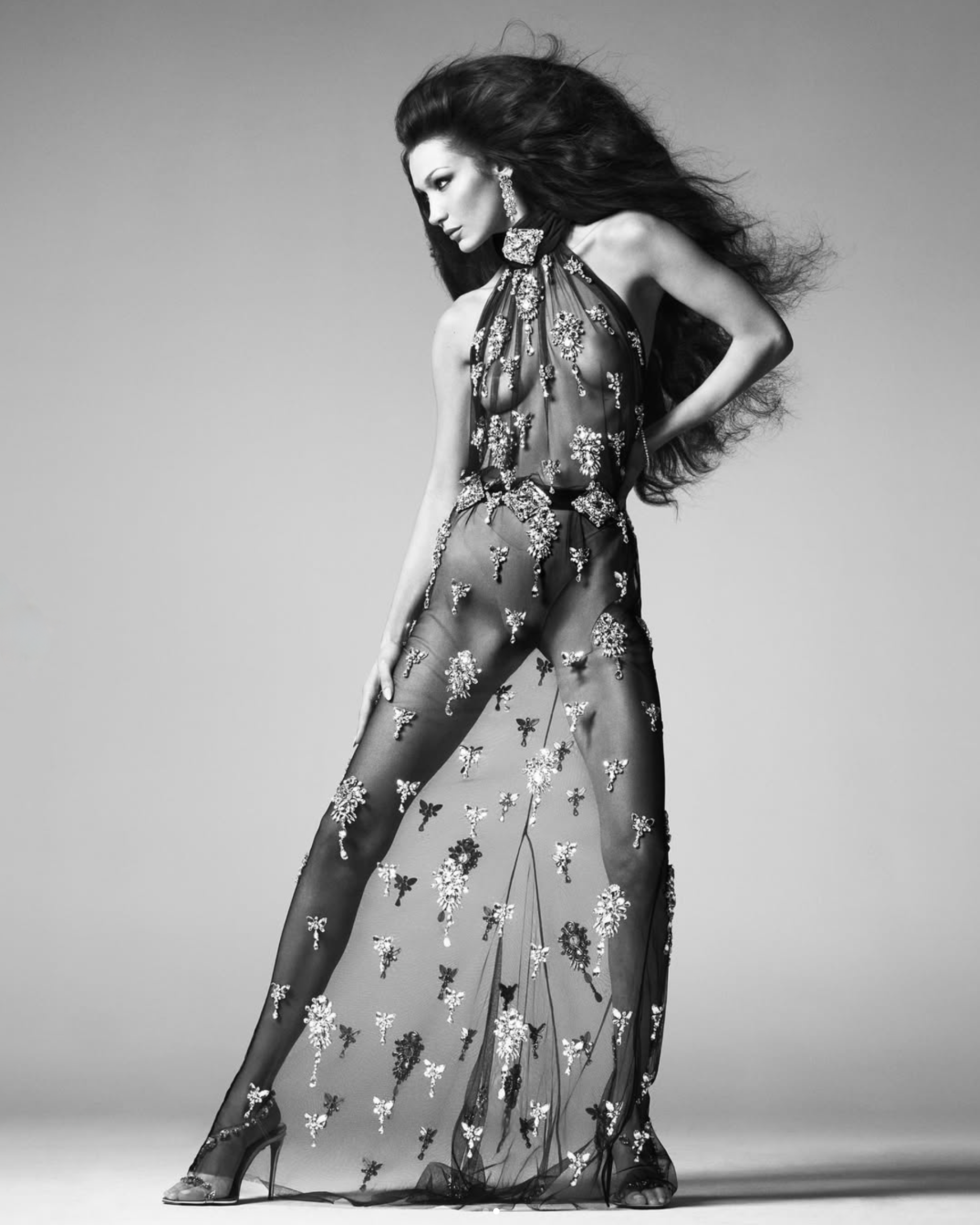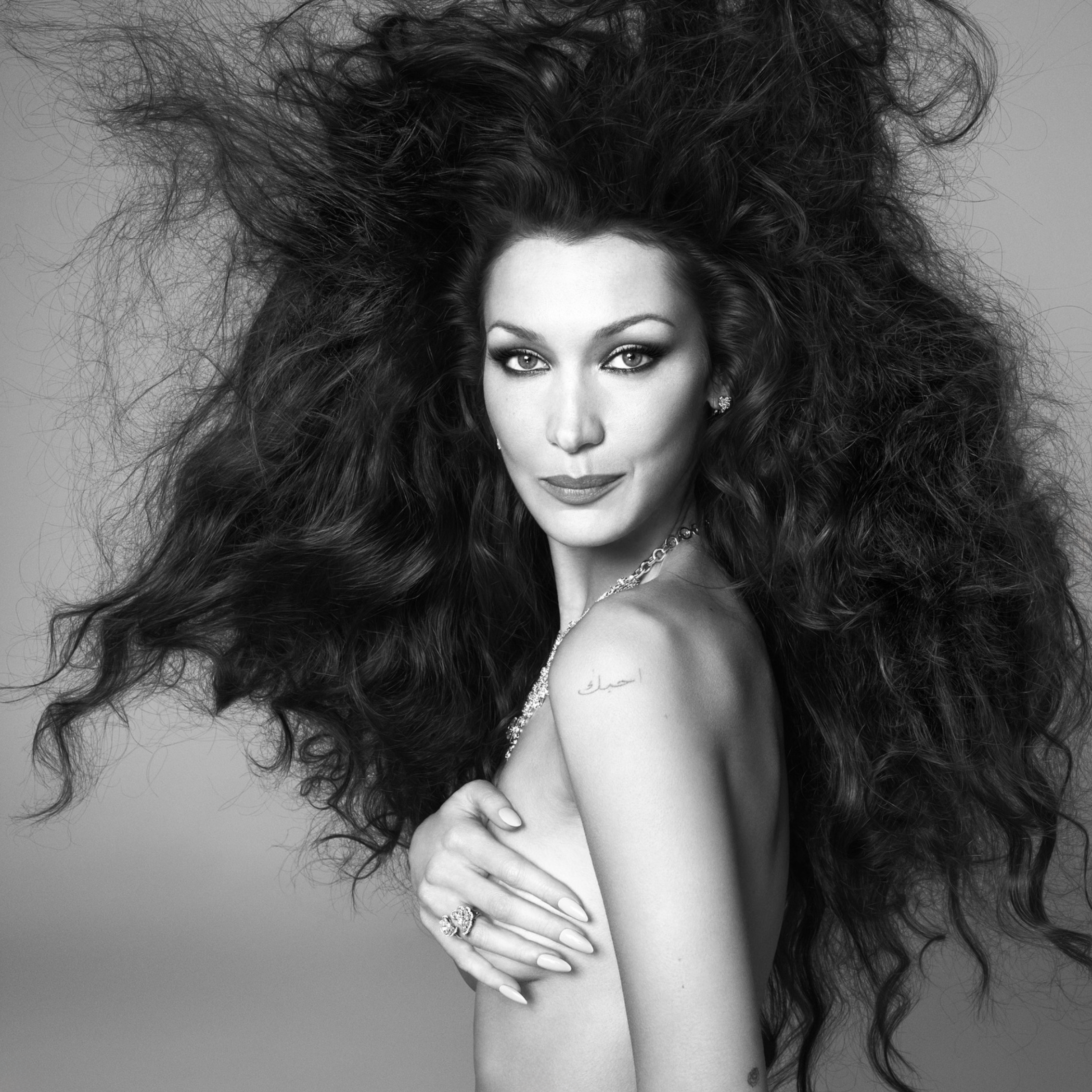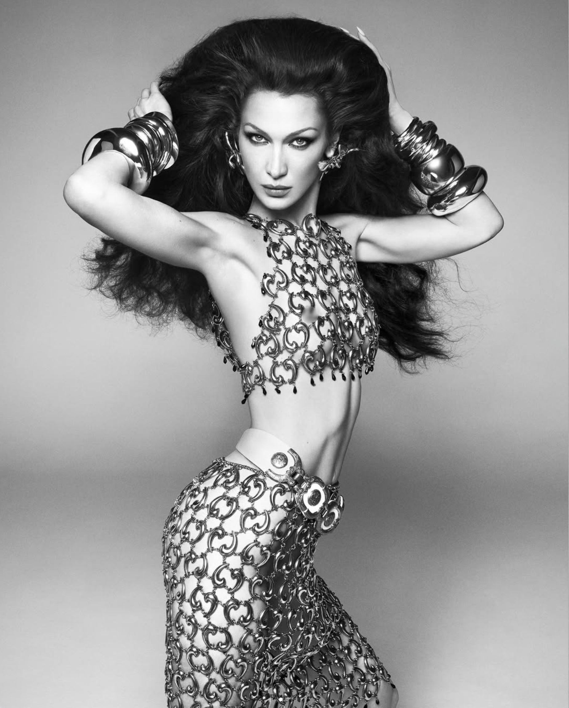 In her British Vogue cover interview and fashion shoot, Bella is styled by IB Kamara in chain-mail from Etro and Balmain and embellished tulle from Dolce & Gabbana. Her silk crepe cover dress is Saint Laurent by Anthony Vaccarello. High jewelry comes from Chopard — for whom Bella is a global ambassador. Earrings and super bangles are from Alexis Bittar.