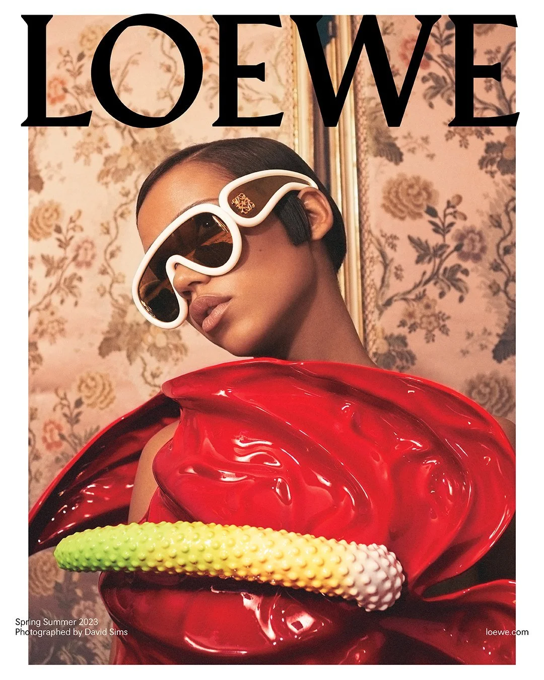 In this LOEWE Spring 2023 Campaign, Taylor Russell wears anthuriums as a breast plate. There’s a lot of human psychology going on here, in the creative mind of Jonathan Anderson.