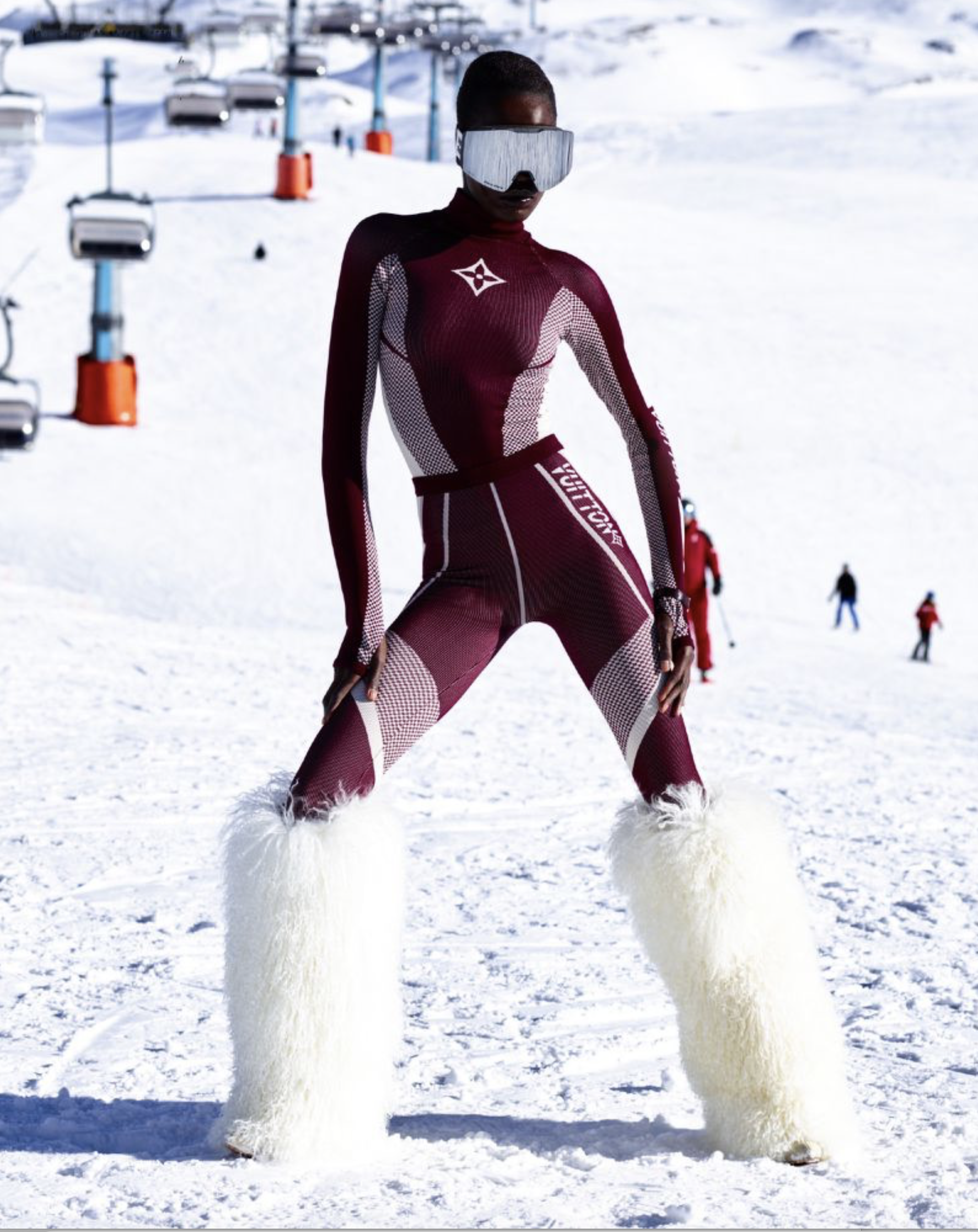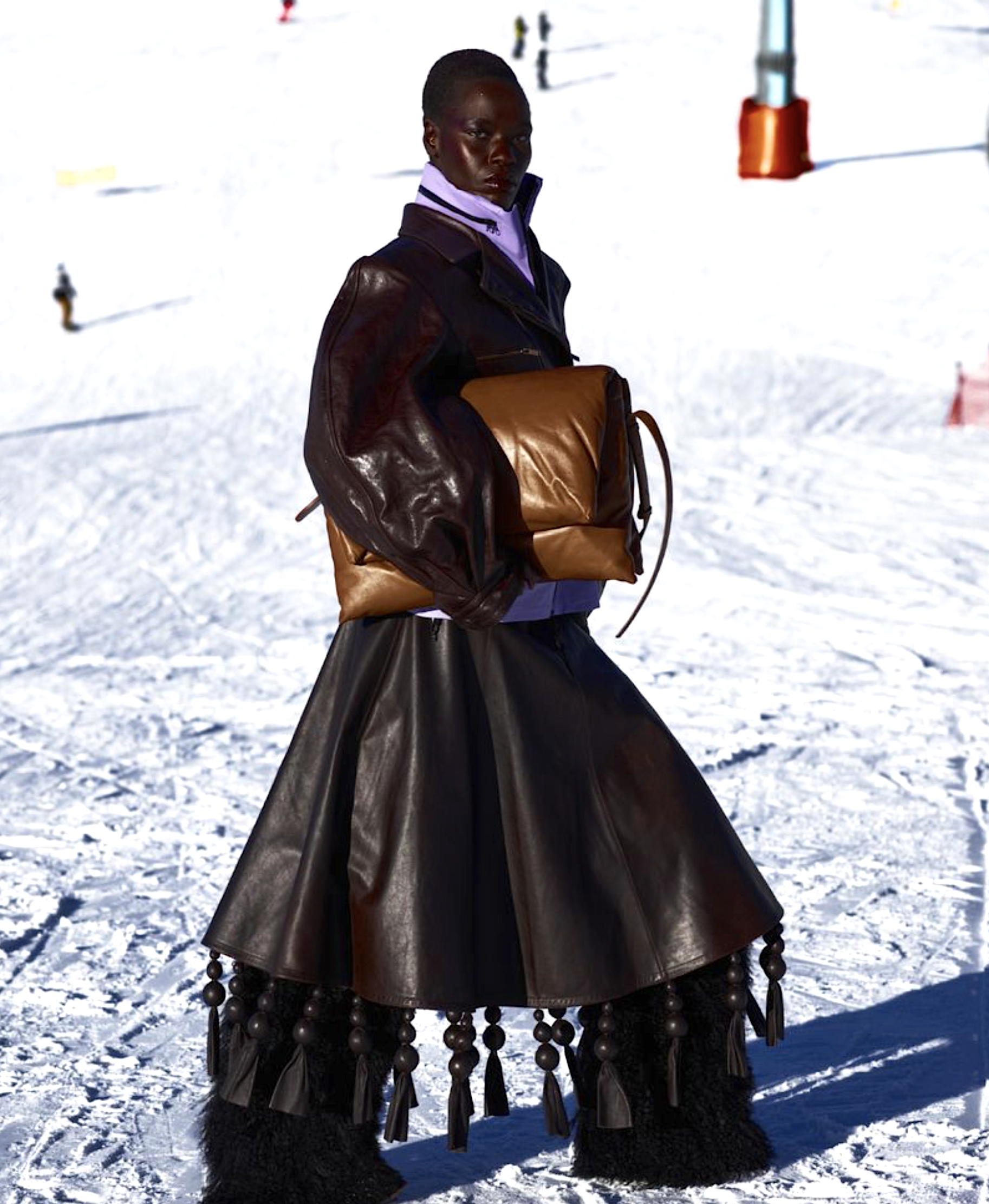 Awar Odhiang morphs into a luxury brands snow bunny, styled by George Krakowiak in a bright yellow Balenciaga coat created by Pierpaolo Piccioli for Vogue Italia [IG] February 2026 issue. The fashion shoot team includes photographer Rafael Pavarotti [IG], who set up his creative camp in Cervinia in the Italian Alps. / Hair by Franco Gobbi; makeup by Chiao Li Hsu