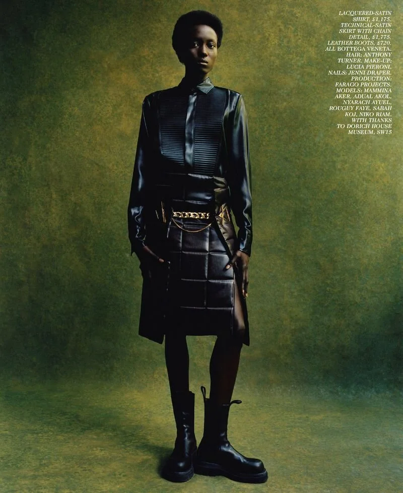 Bottega Veneta designer Daniel Lee was the focus of an editorial ‘The Quiet Radical’, featured in the October 2019 issue of British Vogue. Jamie Hawkesworth captured a quintet of black beauty models including Mammina Aker, Niko Riam, Nyarach Abouch Ayuel, Roughy Faye and Sabah Koj, styled by Joe McKenna.