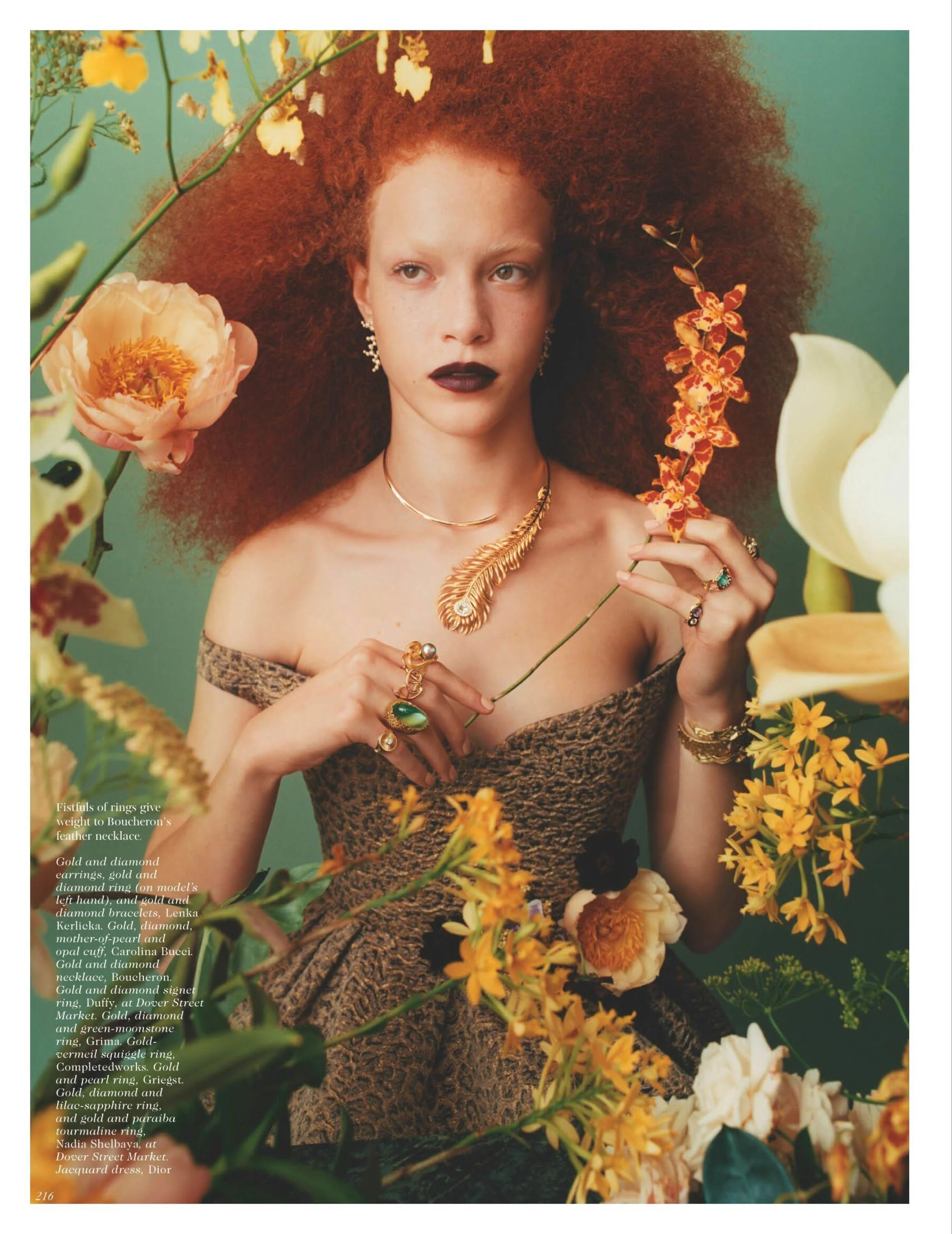 Poppy Kain styles Tianna St. Louis in ‘Treasure Seeking ‘, a collection of intricately-designed jewelry, lensed by Eddie Wrey [IG] for British Vogue December 2021./ Hair by Shiori Takahashi; makeup by Lynsey Alexander