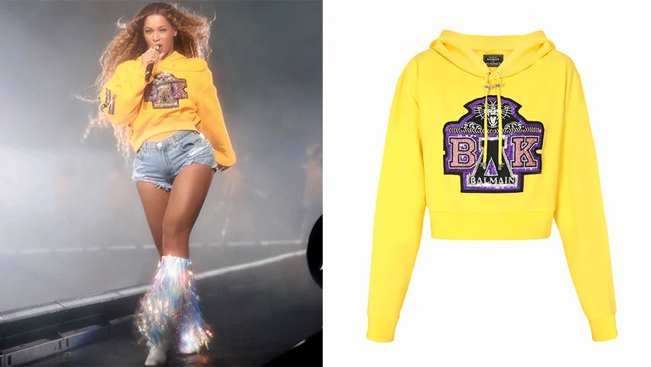 The new collection will launch at Balmain's Paris flagship store from 7pm to 9pm July 13, featuring monogrammed 'BK' hoodies and shirts in black, yellow and pink to match Queen Bey's costumes. The merchandise will roll into other Balmain boutiques as well as Harrods, Barneys New York, Net-a-Porter and more retailers the following day July 14.