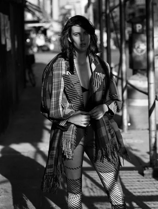 /Model Ruby Aldridge squares off in Annemarie van Drimmelen’s cloth coat editorial for Vogue Netherlands December. Stylist Dimphy Den Otter chooses modern geometry checks and blocks for ‘Light Motiv’./ Hair by Wesley O’Meara; makeup by Stevie Huynh