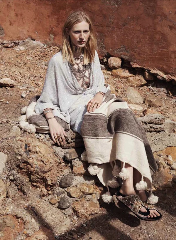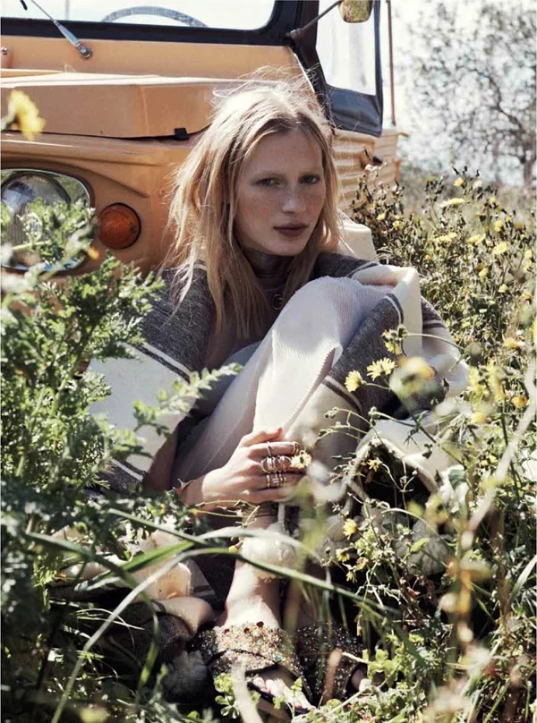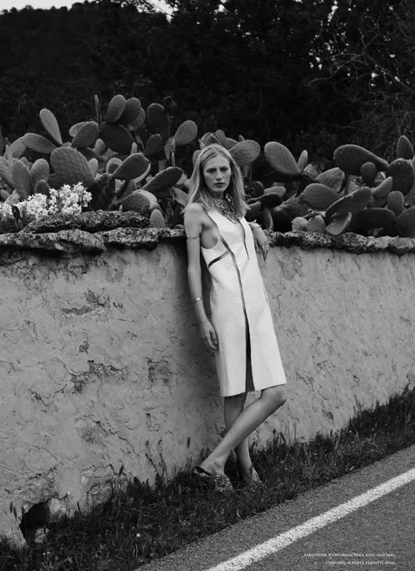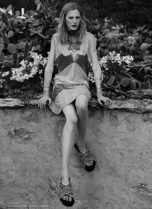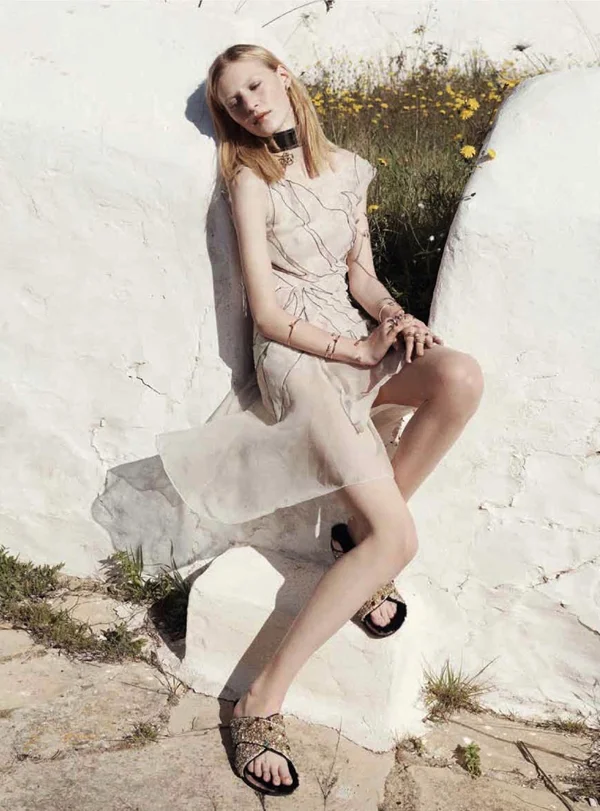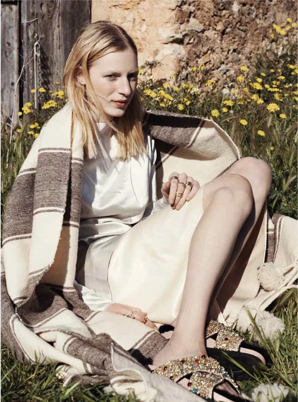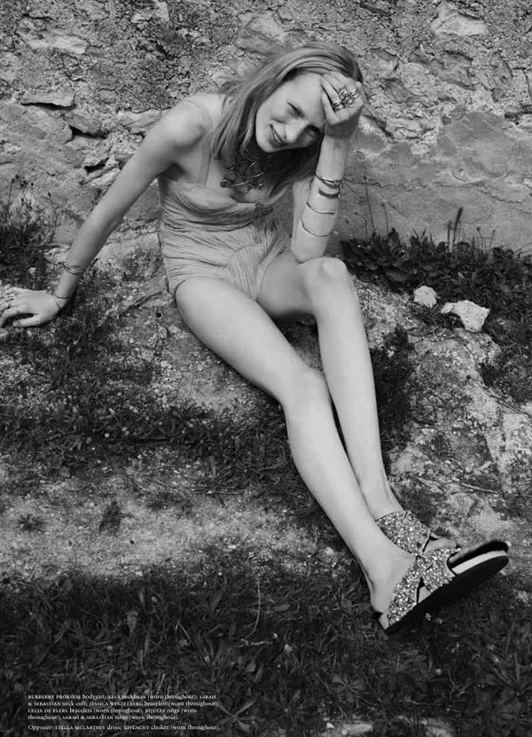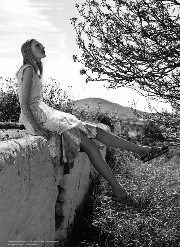 /Julia Nobis wears dreamy whites from the hands of stylist Gillian Wilkins for the lens of Benny Horne.Knee grazing skirts, statement sandals and hefty wools create a whimsical shoot for Russh April 2013.