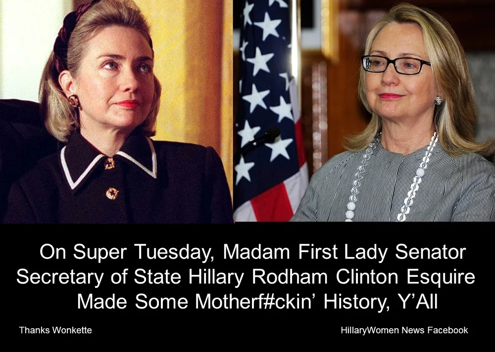 March 02, 2016 On Super Tuesday, Madam First Lady Senator Secretary of State Hillary Rodham Clinton Esquire Made Some Motherf#ckin' History, Y'All March 02, 2016/ Anne Enke On Super Tuesday, Madam First Lady Senator Secretary of State Hillary Rodham Clinton Esquire Made Some Motherf#ckin' History, Y'All