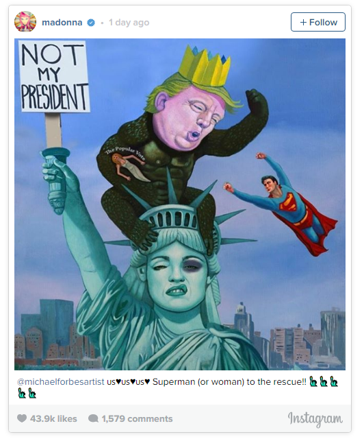 The black eye is perfect because this is how we feel. Madonna is never one to walk away from controversy, and she was quick to share this new artwork by Scottish artist Michael Forbes. The artist portrays a caricature-like image of the President-elect as 'King Kong Trump' sitting on the head of our beloved Statue of Liberty, personified by Madonna. The human rights icon is holding a sign saying 'Not My President' -- a declaration that Hillary Clinton won the popular vote by nearly 3 million Americans.