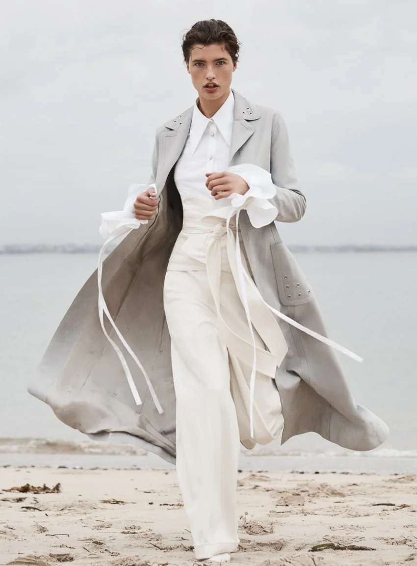 Top model Julia Van Os is styled by Kate Darvill in fall-forward neutrals lensed by Max Papendieck as 'Strom Rider' for Vogue Australia June 2017./ Hair by Koh; makeup by Linda Jefferyes