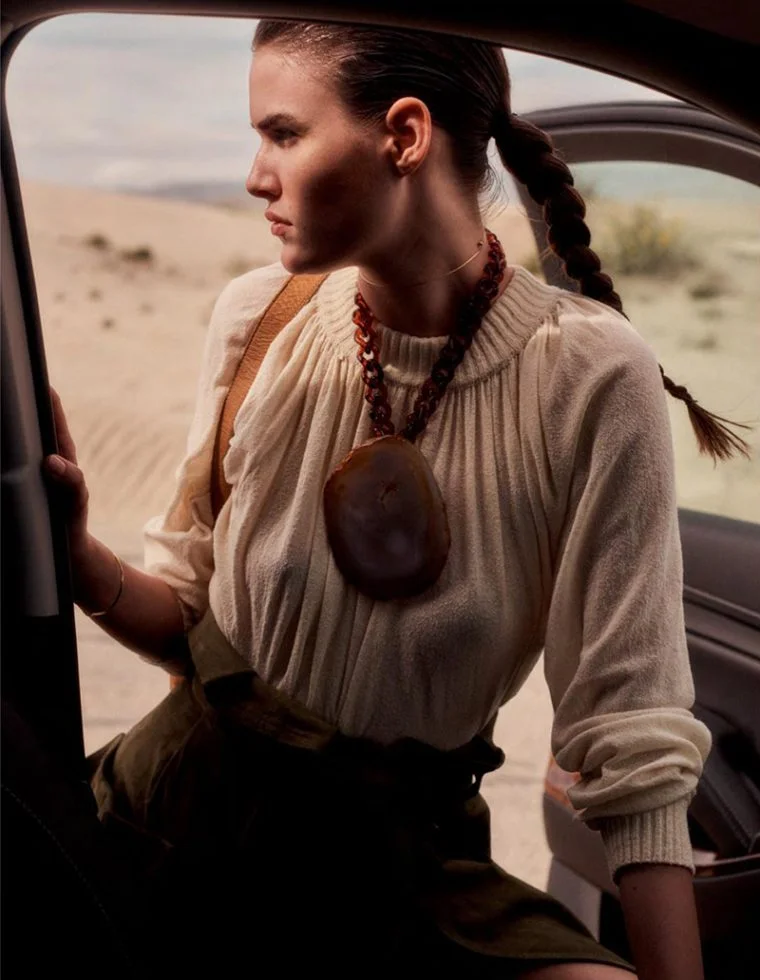 Vanessa Moody is styled by Sara Fernandez in desert neutrals for 'Lajano Oeste', lensed by Benny Horne for Vogue Spain July 2017./ Hair by James Row; makeup by Lottie Stannard