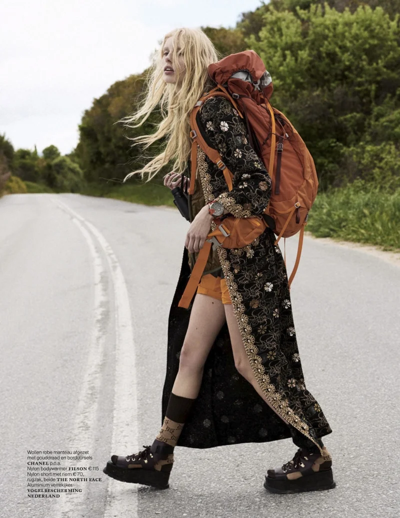 Model Jessie Bloemendaal is a bohemian adventurer, styled by Marije Goekoop in colorful transitional outdoors looks for 'World's End'. Photographer Paul Bellaart trains his lens on Jessie's journey for Vogue Netherlands June 2017 -- in a fashion message with a subtle but important message if the photo montage is actually making a statement./ Hair & makeup by Eva Copper