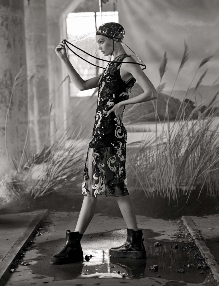 Supermodel Karlie Kloss is styled by Patti Wilson for Ethan James Green black and whites for Vogue Italy June 2017./ Hair by Shon; makeup by Kanako Takase